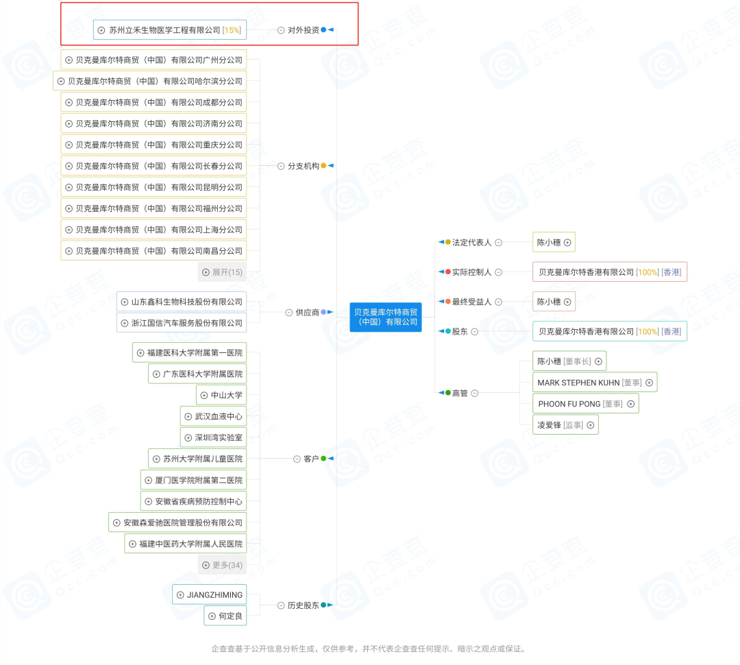 而在贝克曼库尔特商贸(中国)有限公司下面也投资了一家本土企业,苏州立禾生物医学工程有限公司。