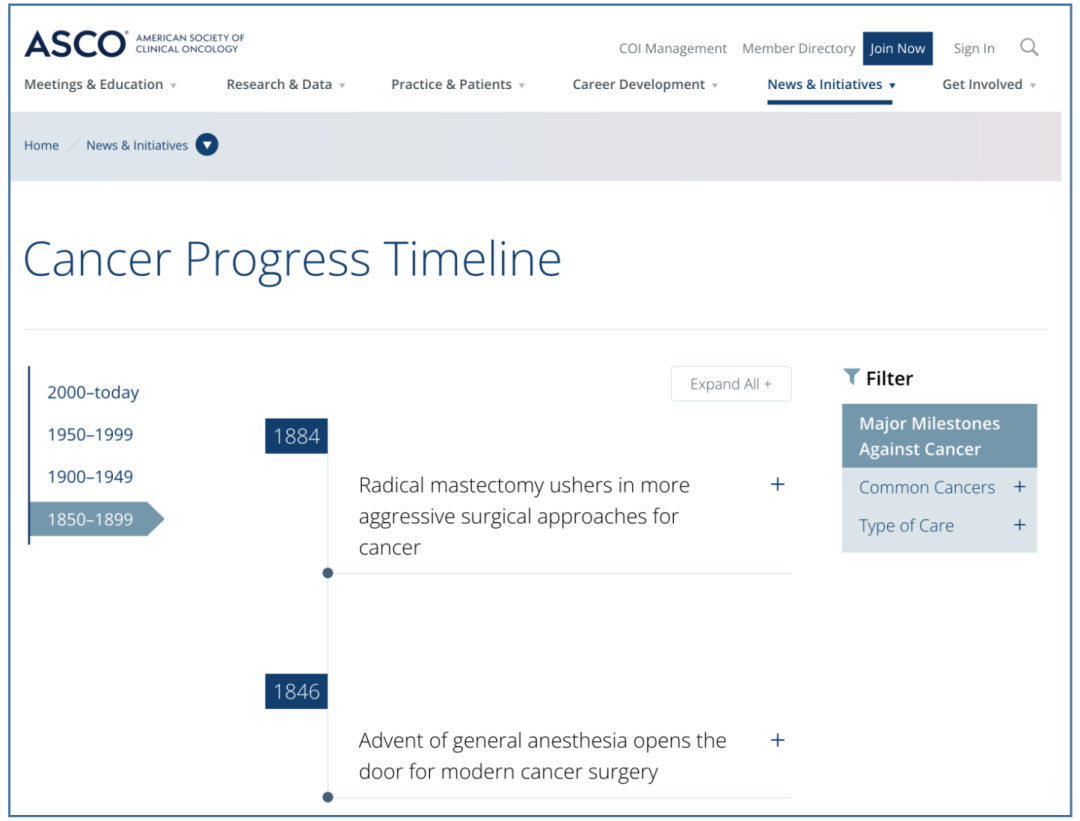 或许是为了纪念他们的国家癌症法案颁布 50 周年,ASCO 官网专门建立了一个叫做 Cancer Progress Timeline 的页面: