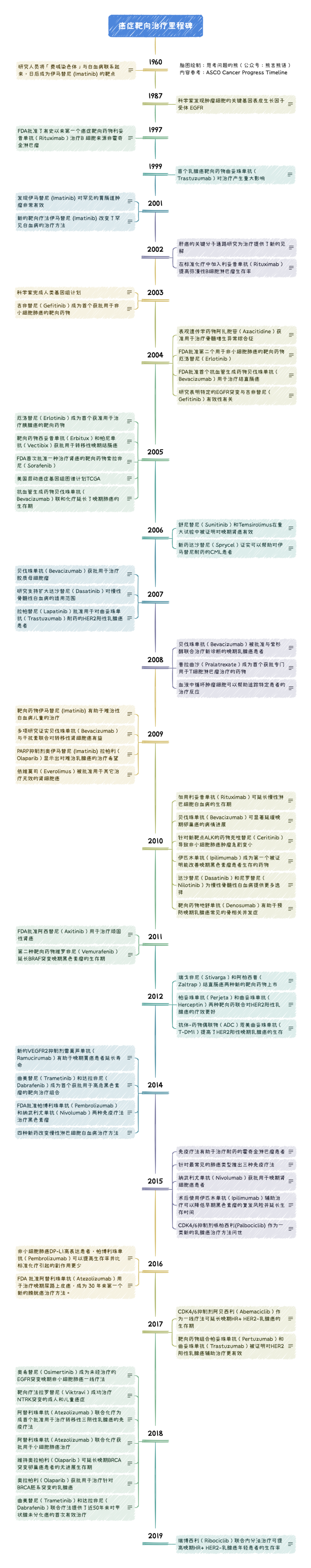 时间线内容突出了癌症治疗和研究领域的一些最重要的进展,几乎所有的里程碑都是严格进行的临床试验结果。我挑选其中靶向治疗相关内容进行学习梳理后有了今天这篇文章。