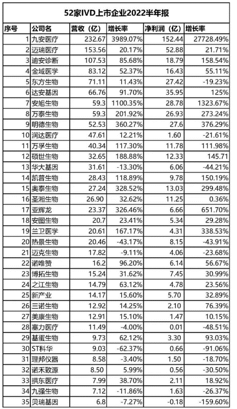 过去几周,在A股上市的52家IVD企业的2022上半年报都陆续出来了,虽然大部分企业的营收都在增长,特别是一些以出口为主的IVD企业,比如九安医疗,因为Omicron BA.1和Omicron BA.2疫情的影响,营收增长非常高。但是依然有12家IVD上市企业的营收出现了下滑。