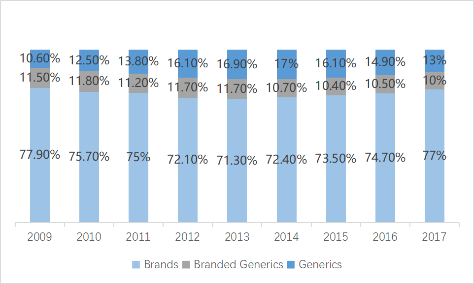 2020年国内市场创新药占比已经从2018年的5%提升至8%,但原研药整体销售占比不足30%;而美国、日本、德国等发达国家原研药销售占比超过了50%,其中美国更是接近80%。