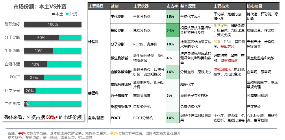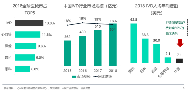 1.3 行业总体特征 1.3.1 特征一:市场大、发展快、有成长潜力IVD行业市场大、发展快、有成长潜力。它是全球医疗器械最大的细分市场。2018年以13%的市占率排名第一,高于心血管(11.6%)、影像(9.8%)和骨科(9%)。2018年中国IVD行业的市场规模达到604亿元,并且每年以18%-19%的速度稳步快速增长。 和发达国家相比,中国的IVD人均年消费额只有7美元,接近美国的1/9、日本的1/6、西欧的1/4——具有上升空间。究其原因,供给端方面,我国IVD产业起步晚,技术落后,检测标的物种类和检测方法数量和国外差距大——美国和日本能提供的检测项目超过5000种,而中国目前只有2000种。 需求端方面, 群众意识不强,比如肺癌的检查,不少国外患者在早期就会被发现并治疗,而在中国,大多患者发现时已是晚期。另外,国内还有很多项目没有进医保,商业保险覆盖面也不足,很大程度影响IVD项目消费。 行业总体特征一:市场大、发展快、有成长潜力 1.3.2 特征二:细分领域众多,中、高端基本被外资垄断IVD行业细分领域众多,中、高端基本被外资垄断。 医院检验科囊括了IVD行业81%的应用场景。根据技术精度要求的从低到高,可以分为生化、免疫和分子诊断。 生化诊断是基于糖类、脂类等生物大分子水平的检测。以18%的市占率排名第二,核心项目包括糖代谢、肝功能和肾功能。它是中国IVD企业最早突破的领域,国产率达50%,已是竞争红海。由于技术门槛相对较低,国内同质化竞争明显。 免疫诊断是基于抗原抗体水平的检测。市占率最高,达34%,主要包括癌症筛查和传染病检测。其中酶联免疫基本实现国产,但这种方法正在被更先进的化学发光所淘汰。化学发光的国产率只有20%,技术壁垒较高,仪器以封闭设计为主,外资形成垄断。国内,新产业是这一领域的龙头。 分子诊断是基于基因水平的检测。市占率达10%,主要包括无创产检、传染病和癌症筛查。虽然分子诊断在我国起步较晚,仪器研发和国外差距巨大——二代测序的国产率只有5%。但试剂和服务具有明显优势。代表公司有艾德生物、华大基因。 此外,血液体液诊断主要指血常规和尿常规;微生物诊断主要指微生物鉴定和药敏。 病理科是IVD行业第二类应用场景,不过国内发展不成熟,市占率只有5%。安必平是唯一上市公司,专注病理诊断产品的研发和服务。 急诊和基层是第三类应用场景,POCT 是最合适的产品。POCT 指在现场采样,即刻出结果的方法。它可以横跨多个技术平台,使用多种检测方法。血糖仪、验孕棒就是例子。该领域竞争激烈,技术难度不同,国产率不同,综合来看,国产率在35%左右。