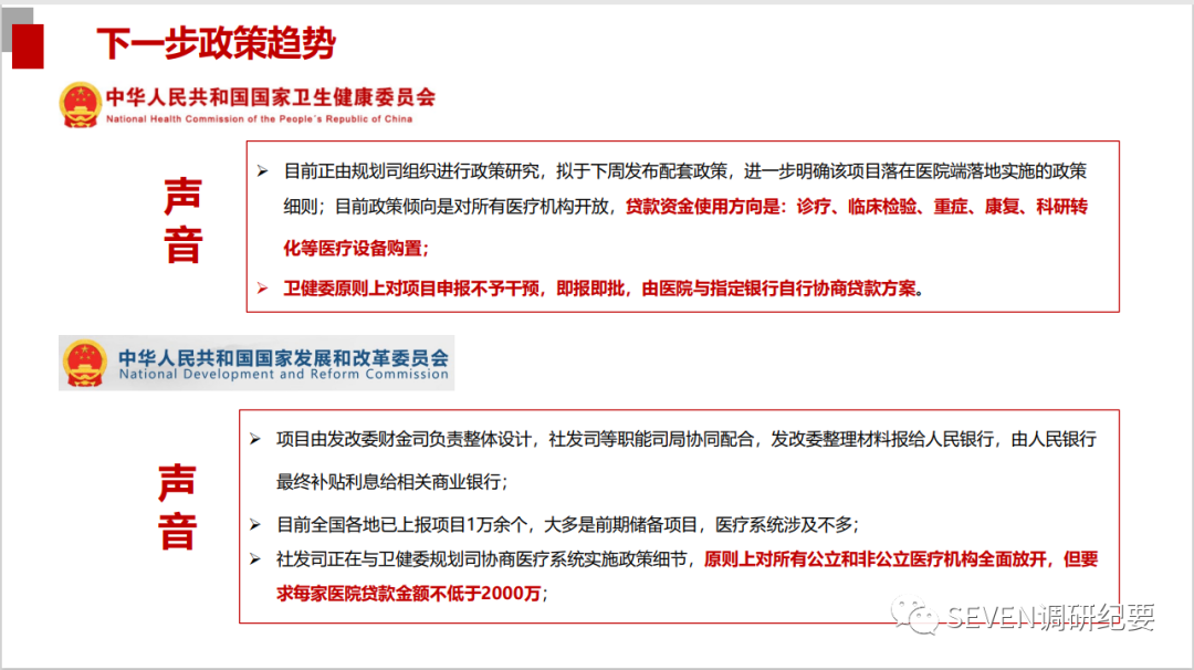 在2010年前后,卫生行业有文件规定医疗机构不允许贷款购买设备。在中央和地方财政投入不足的情况下,医疗系统的基建和设备购买面临巨大的资金缺口。这次贴息贷款政策一方面是促进消费,另一方面医疗行业疫情之后在方舱及新冠储备医院、急救能力建设、千县工程和区域医疗中心等方面有建设需求,原本有些项目有财政预算, 但由于疫情后财政预算吃紧迟迟没有落实。 而这笔钱填补医疗建设的资金缺口。