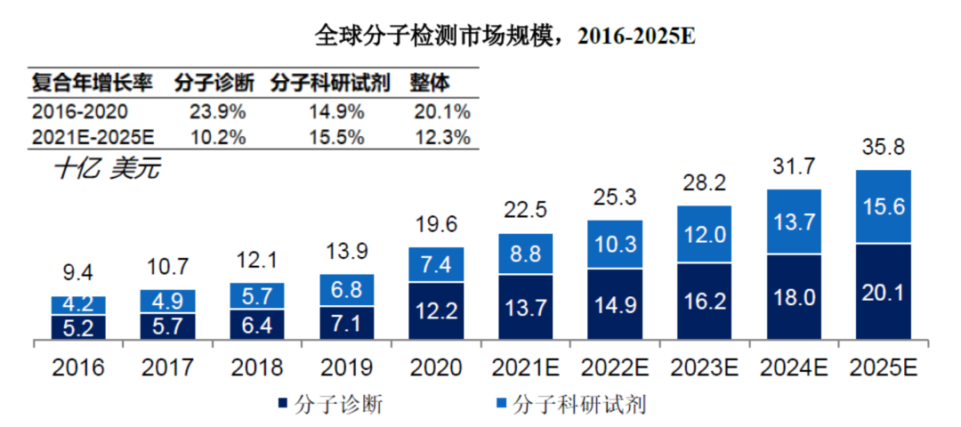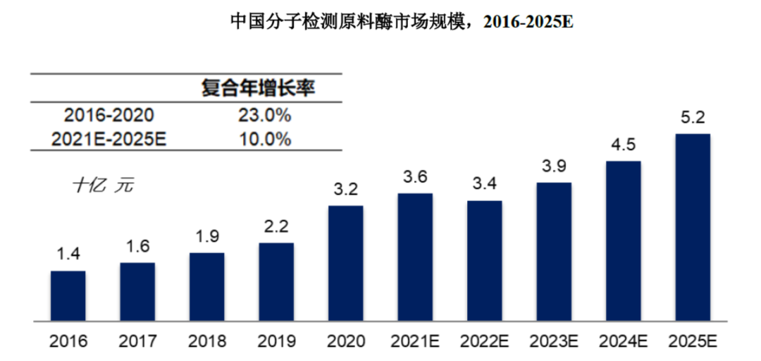 分子检测是利用分子生物学技术,对体液、血液、组织等样本中的核酸物质进行检测和分析。分子诊断是分子检测技术在体外诊断中的应用,是目前体外诊断领域发展最快、技术最前沿的方向。除疾病诊断外,科研院所、药企、CRO等也会使用分子检测技术和产品开展研发工作。分子检测根据技术平台的不同可分为聚合酶链核酸扩增技术(PCR)、基因测序、荧光原位杂交(FISH)、基因芯片和核酸质谱等,具体情况如下:1969年,科学家利用基因探针及同位素标记核酸探针进行基因定位,创造了原位杂交技术,首次利用分子检测技术进行遗传病基因诊断。自此以后,随着分子生物学技术迅速发展,基因测序技术、PCR技术、基因芯片等技术相继问世,推动了分子检测领域的进步。PCR技术是目前使用最广泛的分子检测技术。自1983年被发明以来,PCR技术已应用于生物科学研究的所有领域,包括临床、农业、法医和诊断,是生命科学研究领域中一次革命。随着现代分子生物学技术逐渐完备,PCR技术也在不断发展创新,实时荧光定量PCR(qPCR)技术于1992年问世,该技术可以实时地监控PCR进程,并对核酸含量进行定量分析,目前已成为PCR技术中的主流,也是分子检测行业最普及的技术平台。基因测序技术是最前沿的分子检测技术之一。第一代测序技术发明于1977年,但该技术只能获得一条长度在700-1000个碱基的序列,无法满足现代科学发展对生物基因序列获取的迫切需求。高通量测序是对传统测序方法的变革,一次运行即可同时得到几十万到几百万条核酸分子的序列,因此也被称为新一代测序(NGS)或二代测序。PCR技术更适合已知突变基因的定量检测,具有检测速度快、准确性高、性价比高的特点,在传染病、肿瘤诊断、遗传病等临床领域有广泛应用;基因测序技术可检测未知序列和未知突变的基因,适合高通量、多位点的基因检测,在科研、肿瘤筛查和产前筛查等领域应用较多,但检测费用相对较高。国内分子检测产业的上游为提供酶、引物、探针和底物的分子检测原料厂商和仪器元件供应商,中游为核酸样本保存试剂、核酸提取试剂、核酸检测试剂盒生产商和PCR仪、测序仪等设备生产商,下游是试剂和仪器的使用者,包括高校、科研机构、药企、CRO、医院、第三方医学实验室、血站、体检中心等。近年来,随着人口老龄化、健康意识的提高以及新兴技术的进步,分子检测市场规模稳步增长。从2016年至2020年,全球分子检测市场由94.1亿美元增长至195.8亿美元,期间年复合增长率为20.1%,全球分子诊断市场相较分子科研试剂市场增速较高,期间年复合增长率分别为23.9%和14.9%。未来五年,全球分子检测行业将持续发展,至2025年,全球分子检测市场规模将达到357.8亿美元,2021-2025年的复合增长率将达12.3%。近年来国内分子检测行业发展迅速,2016年至2020年,中国分子检测市场从82.0亿元增长至361.7亿元,复合年增长率为44.9%;未来五年,我国分级医疗系统的完善、科技创新和相关政策的支持将持续推动分子检测行业的发展,至2025年,中国分子检测市场规模将达到480.7亿元。酶和引物、探针、底物等是分子检测试剂的主要原材料,其中,酶是分子检测原料中发挥生物活性的组分,直接影响分子检测试剂包括灵敏度、稳定性、检测时间等多项性能水平,决定了分子检测结果的准确性,是分子检测试剂原材料中最核心的组分。分子检测原料酶根据不同功能可以分为聚合酶、反转录酶、二代测序酶、等温扩增酶等,在PCR、二代测序等多种分子检测技术中均发挥了重要作用。分子检测原料酶行业是分子检测行业产业链上游,广阔的分子检测试剂行业发展前景将反哺分子检测酶原料市场成长。2020年在巨大的核酸检测需求面前,市场对分子诊断试剂刚性需求亟待满足,全球分子检测原料酶市场规模从2016年的19.3亿美元增长至2020年的39.7亿美元。预计到2025年,全球分子检测原料酶市场规模将达到65.3亿美元。国内分子检测原料酶市场规模从2016年的14.0亿元增长至2020的32.1亿元,预计到2025年,国内分子检测原料酶市场规模将达到52.1亿元。国内分子检测原料酶市场不断高速增长的主要驱动力是:1)疫情后分子诊断基层渗透率提升,检测机构和人数持续增加;2)中国分子诊断市场和科研用分子检测试剂市场发展迅速,持续带动分子检测原料行业发展;3)国家政策鼓励与重视分子检测试剂关键原料自主可控,原料酶产业国产化加速。
