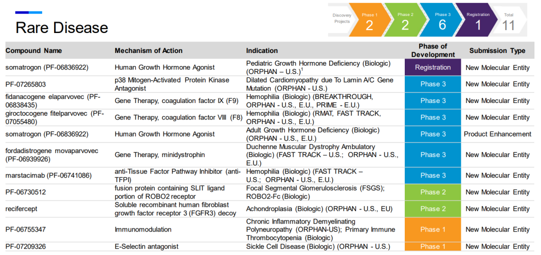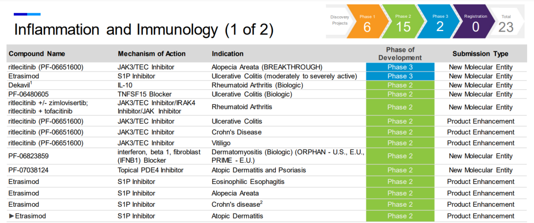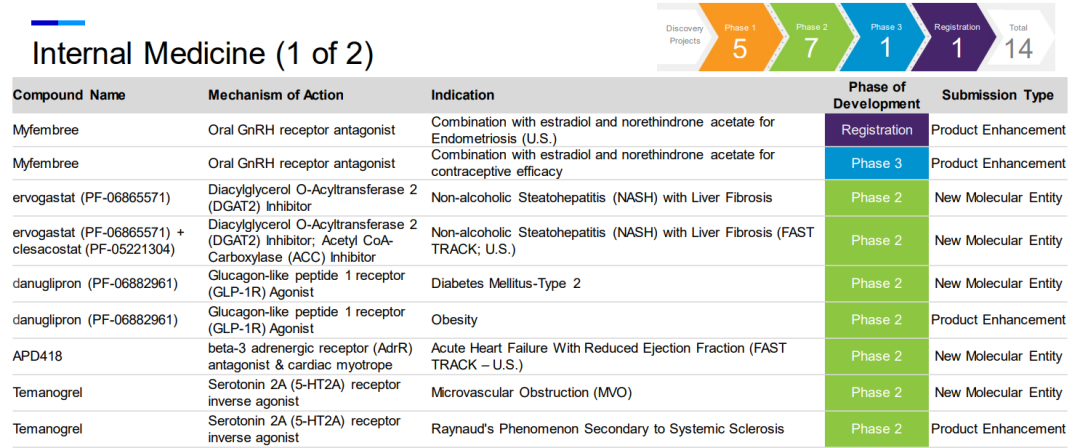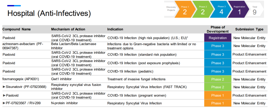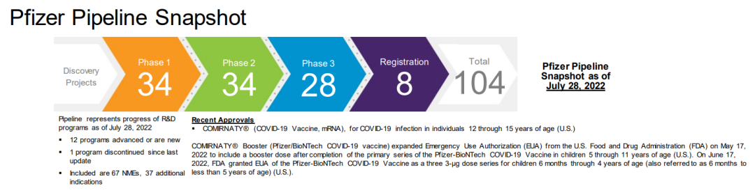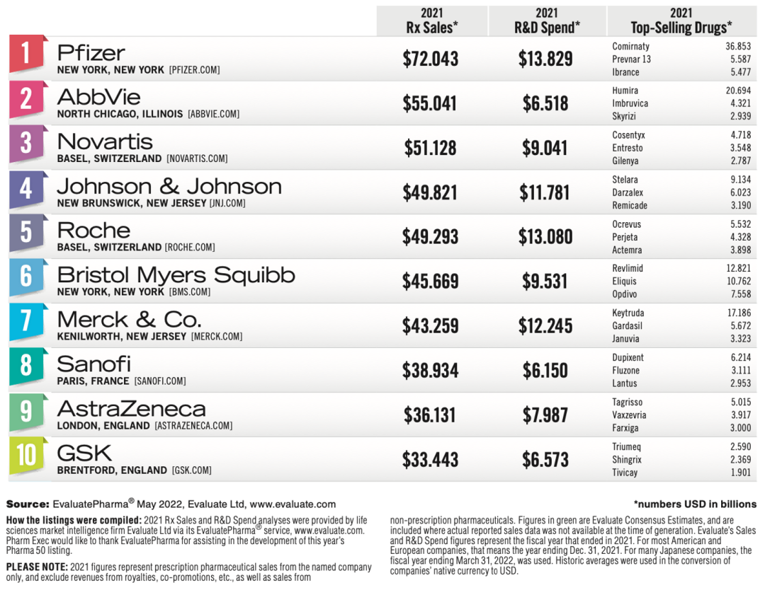 美国《Pharmaceutical Executive》杂志每年都会发布一份全球制药企业 50 强(Pharm Exec Top 50)名单。按照 2021 年度处方药业务销售收入排名,2022年前十强分别是辉瑞、艾伯维、诺华、强生、罗氏、百时美施贵宝、默沙东、赛诺菲、阿斯利康、葛兰素史克。其中,辉瑞以720.43亿美元销售收入的绝对优势位居榜首。 图片来源:Pharmaceutical Executive (点击图片查看大图) 榜首,对辉瑞来说几乎是家常便饭。毕竟进入21世纪以来,辉瑞共屠榜18次,更是从2001年到2013年连续蝉联,名副其实的“宇宙药厂”。不过,宇宙药厂也不是常常如意,2020年因为产品危机排名滑至第3,2021年因为剥离成熟药品进一步从第3跌到了第8。2022年重回巅峰与新冠疫苗的现金回报息息相关。这个答案我们似乎可以先从辉瑞的发展史管窥一二。 从化学品小作坊到宇宙药厂 1849年,Charles Pfizer和Charles Erhart表兄弟俩在纽约布鲁克林的一座红砖楼房中创立了查尔斯•辉瑞公司。早期的辉瑞是一家以生产化工产品为主要经营业务的化学品公司,药物作为化学品的一种也属于公司的经营范围之内。1861年爆发的南北战争给了辉瑞公司发展的机会,战争中辉瑞向北军提供了大量的酒石酸、碘、吗啡和氯仿等产品,公司随着战争的进展而迅速发展,成为美国国内较大的化学品生产企业之一。 1880年开始,辉瑞公司开始生产柠檬酸,依靠其带来的收入开始大量购置资产建设实验室。一战爆发后,生产柠檬酸的原材料酸橙进口严重受限,无奈之下辉瑞只能寻找替代品。改变来自食品化学家James Currie,他在1919年发现,通过霉菌发酵将糖转化为柠檬酸的途径,柠檬酸生产不再掣肘于酸橙等水果,产量实现飞跃式增长。辉瑞没有为发酵生产柠檬酸技术申请专利,但其作为企业机密存在,为辉瑞在之后多年的发展和成长做出了巨大的贡献。 凭着柠檬酸发酵技术奠定的基础,辉瑞获得生产青霉素的优势。 二战期间,辉瑞向盟军提供了大量青霉素,诺曼底战役期间,盟军携带的青霉素有90%来自辉瑞。青霉素的成功让辉瑞展开了制药企业的道路,并以此经验进一步扩展到生产出其它抗生素。1950年,辉瑞研发合成了土霉素,并首次成立了销售代表队伍,开始从一家化工企业向专注研发的药品生产企业转型。结果证明该决策的正确性,当年辉瑞的总销量达到6000万美元,土霉素在两年时间贡献了42%的营收。此后的四环素等药物的成功研发都给辉瑞带来了巨大的经济利益。 时间来到20世纪下半叶,辉瑞紧随潮流开启多元化发展道路,业务范围从日用品、化妆品、护肤品、石油、金属材料甚至发展到宠物用品。这样多元的发展让其躲过了纯药企被收购的命运,但也极大地稀释了作为药企的研发投入。1972年开始,辉瑞新任CEO Edward Pratt意识到这个问题后,开启变革,果断剔除了不赚钱的业务,将公司资源集中于制药行业上,研发费用也从销售收入的5%增加至15%-20%,到其任期为止的1991年,研发投入增加到7.57亿美元。 研发费用到位后,辉瑞的研发产出也相当给力,比如高血压药物Minipress(哌唑嗪)、消炎药Feldene(吡罗昔康)、抗真菌药物Diflucan (氟康唑)、糖尿病药物Glucotrol(格列吡嗪)、抗生素Unasyn (氨苄西林舒巴坦)、心绞痛和高血压药物Procardia XL等。其中,1982年推出的Feldene成为辉瑞第一个销量达到10亿美元的产品,也是当时全球销量最高的处方消炎药。尽管如此,此时的辉瑞产品线依旧可以说是单薄,即抗生素和ALZA的改剂型产品。 直到1992年推出的降压药Norvasc (络活喜,氨氯地平),成为辉瑞的主力产品,在1999年全球销量为37.95亿美元。以及1998年推出的勃起功能障碍药物小蓝片“Viagra” (万艾可、伟哥),2000年其占据92%的市场份额,据统计在全世界,每秒钟就有四粒万艾可被患者服用。20多年来,万艾可一直是辉瑞的稳定收入来源。 也是因为络活喜和万艾可商业上的成功带来的底气,辉瑞开启了买买买之路。 2000年,辉瑞以换股方式作价900亿美元收购了华纳兰伯特(Warner-Lambert)公司,一举成为全球第二大制药公司,并将最畅销的降血脂处方药之一的Lipitor(立普妥,阿托伐他汀)收入囊中,完成了自身心血管产品线的战略性完善。2006年,立普妥全球销售额为129亿美元,成为医药史上第一个销量突破百亿美元的药物。 2002年,辉瑞再次豪掷600亿美元收购了其合作伙伴法玛西亚(Pharmacia)公司,开启了“宇宙药厂”篇章。此次收购虽然有效地扩充了辉瑞的产品线,但其看上的关节炎药物Celebrex(西乐葆,塞来昔布)并没有复制立普妥的成功。 图片来源:《海外并购启示录-制药企业的并购迷思》 (点击图片查看大图) 2009年,辉瑞又以680亿美元并购竞争对手惠氏(Myeth)公司,弥补自身作为化学制药领域出身的短板,进军生物制药领域。并购之后,辉瑞在生物制剂的在研产品线拥有6个疫苗和27个生物制品,成为全球领先的生物制药企业。 这三桩收购成为辉瑞史上最具有代表性的收购案例,其他的大型收购计划如阿斯利康、艾尔建均以失败告终。通过自身研发、收购、合作以及剥离,辉瑞成为一家纯粹地专注于创新生物制药业务的公司,并形成当前的产品管线。 产品管线广泛布局 104个项目临床在研 根据辉瑞官网披露的数据,截至2022年7月28日,辉瑞共有104个临床在研项目。其中I、II、III期临床分别为34、34、28个,在注册阶段有8个,1个临床适应症终止开发。这些管线涉及67个NMEs,还有37个适应症拓展。辉瑞产