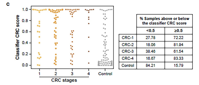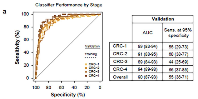 在癌症仍处于早期阶段时对其进行检测和治疗,可以挽救许多生命,降低发病率,并减轻癌症对医疗系统的负担。 液体活检是一种微创方法,用于检测体液如血液和尿液中的早期癌症。开发一种足够强大的液体活检检测方法来检测癌症有很多挑战,尤其是在早期疾病中,肿瘤仅向血液中释放微量生物标记物时。在早期疾病中,循环肿瘤DNA(ctDNA)仅占总无细胞DNA(cfDNA)的0.1–1%。从同一血液样本中测量多种生物标记物的多分析方法可能有助于检测早期癌症。 表观基因组学的变化可能先于肿瘤发生的遗传变化。因此,利用cfDNA的表观基因组进行癌症检测的兴趣越来越大。几个小组已经研究了是否可以通过cfDNA肿瘤部分的表观遗传修饰来检测癌症,因为DNA甲基化、DNA羟甲基化和cfDNA特征可能揭示染色质结构。胞嘧啶的甲基化产生甲基胞嘧啶(5mC)是一种众所周知的控制基因表达的表观遗传机制。5mC被氧化形成5-羟甲基胞嘧啶(5hmC)。5mC和5hmC具有不同的功能作用:5mC存在于异染色质和常染色质中,通常抑制基因表达,而5hmC主要存在于常染色质,与大多数高转录的基因及其增强子相关。 癌症样本中不同的功能作用和分布表明,5mC和5hmC作为生物标记物具有独立的效用。然而,寻找癌症的表观遗传标记物受到了技术限制,区分5mC和5hmC的技术有限。然而,最近出现了几种技术来量化和利用5hmC特征用于通过液体生物检测进行癌症检测。5hmC在晚期转移癌中逐渐丢失的观察结果表明,其作为生物标记物的能力可能是阶段特异性的。 近日,来自剑桥大学的研究团队在杂志Scientific reports上发表了一篇题为“Hydroxymethylation profile of cell-free DNA is a biomarker for early colorectal cancer”的文章,在这项研究中,研究团队测量了整个cfDNA中的5hmC水平,并训练了一个分类器来区分结直肠癌患者和对照组。研究团队在一个独立的验证集中评估了分类器的性能,并评估了其对癌症分期和ctDNA水平的依赖性。研究表明,cfDNA的5hmC图谱是癌症的强预测因子,包括早期癌症检测的高灵敏度。数据表明,cfDNA表观遗传变化产生的5hmC信号在早期阶段比其他分析物更敏感。当5hmC信号与cfDNA片段特征相结合以产生附加信号时,这种灵敏度保持不变。 图片来源:Scientific reports 主要内容 从cfDNA中高效捕获5hmC以产生羟甲基化组学文库 研究团队仅用5 ng cfDNA捕获了含有5hmC残基的cfDNA片段的羟甲基化组学。从2ml血浆中提取cfDNA,使用5ng cfDNA制备Illumina兼容测序文库。测序文库被变性,单链文库被复制以创建一个双链文库,其中只有一链保留表观遗传信息。5hmC残基用修饰的葡萄糖基团进行标记,然后生物素化。使用链霉亲和素珠捕获含有双链DNA片段的5hmC。从5hmC捕获的文库中回收未经表观遗传修饰的复制链,并扩增形成羟甲基化组学富集测序文库。 所有样本中均包含对照DNA序列,以报告羟甲基化组学捕获的有效性和定量。阳性对照组含有1、3或6个5hmC残基,在羟甲基化组学中富集,与输入文库相比,分别多读88、267和658倍。含有6 mC残基或未修饰胞嘧啶的阴性对照未被浓缩(分别为1倍和0.38倍)(图B)。 羟甲基化组学中富集结果。图片来源:Scientific reports 5hmC分类器高效检测包括早期阶段在内的CRC 使用增强子区域中的5hmC水平训练监督分类器算法,以区分CRC和对照组(405个CRC样本和296个对照组)。将5hmC分类器应用于验证集(220个CRC和164个对照),区分CRC和对照组的AUC为90%。AUC 4期最高(94%),在1期略微下降至89%(图A)。 5hmC分类器的特异性为84%,CRC敏感性为80%(1、2、3和4期分别为78%、83%、75%和93%)。在验证样本中,当特异性固定在95%时,以55%的灵敏度检测CRC(所有阶段合并)。 研究团队训练了5hmC分类器,成功地将肺癌(AUC 80%)、乳腺癌(AUC 82%)和前列腺癌(AUC 79%)与对照组区分开来。还训练了一个5hmC分类器,将CRC与其他癌症区分开来(AUC 78%)。且结果表明5hmC分类器对低循环肿瘤DNA(占游离细胞DNA的比例)具有鲁棒性。 5hmC分类器高效检测各期CRC。图片来源:Scientific reports 5hmC分类器在低ctDNA比例下具有鲁棒性 为了进一步研究5hmC分类器在不同癌症阶段的性能相似的发现,使用ichorCNA肿瘤比例统计估计了验证集中cfDNA样本中ctDNA的数量。据报道,ichorCNA的检测限在平均测序深度为0.1x时为3%。 使用3%阈值作为检测限,5hmC分类器正确地区分了97%的可检测肿瘤比例的CRC样本和75%的肿瘤比例低于3%检测阈值的CRC样品(图C)。这表明,当在低ctDNA比例下,5hmC分类器是鲁棒的。因此,研究团队推断5hmC分类器不仅仅依赖于ctDNA部分。 5hmC分类器在低ctDNA比例下具有鲁棒性。图片来源:Scientific reports 白细胞介素信号可能推动基于5hmC的分类 为了研究驱动5hmC分类器在低ctDNA比例CRC样本中性能的生物信号,将分类器的特征增强子映射到基因名称,并在Key Pathway Advisor软件(Clarivate)中查询。IL11信号转导到PIK3CA级联是最重要的途径。这表明来自免疫系统的cfDNA片段可能驱动检测。研究团队进一步评估了仅使用早期CRC样本(1期和2期)训练分类器时识别出的特征,并将其与仅使用晚期CRC样本训练的分类器的特征进行了比较(3期和4期)。结果发现白细胞介素信号存在于晚期CRC中。 白细胞介素信号可能推动基于5hmC的分类。图片来源:Scientific reports 与5hmC分类器相比,片段组学分类器的性能对癌症分期和ctDNA比例的依赖性更大 为了调查观察到的5hmC分类器明显缺乏分期依赖性,研究团队研究了来自相同样本(验证集)