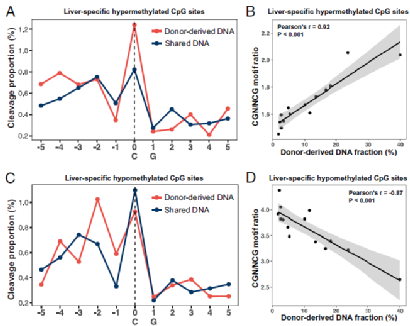 图2. CGN/NCG基序比的分析,来源:PNAS 上述结果证明了DNA甲基化与cfDNA裂解谱相关cfDNA的CGN/NCG基序比可以用来判断cfDNA基因组区域的甲基化水平。前期研究表明,cfDNA分子起源的组织可以通过组织特异性甲基化模式来确定。因此,研究团队进一步测试了cfDNA的裂解概况是否可以反映组织特异性高甲基化和低甲基化CpG位点,以及与之相关CGN/NCG基序比是否可作为分析组织对血浆DNA贡献的替代物。为此,研究团队首先以肝移植为模型,探索追踪CpG周围组织特异性裂解模式的可行性。通过分析此前报道的肝移植受者血浆DNA样本的亚硫酸氢盐测序结果,研究团队确定了肝脏特异性的高甲基化和低甲基化CpG位点。供体来源的DNA分子在肝脏特异性高甲基化CpG位点0位置的裂解比例与共享的相比增加了51.0%;与之相反,在位置1对应的比例下降了31.3%。因此,研究团队认为,基于与甲基化差异相关的特定裂解偏好,CGN和NCG基序的表达与CpG位点甲基化的变化相关。