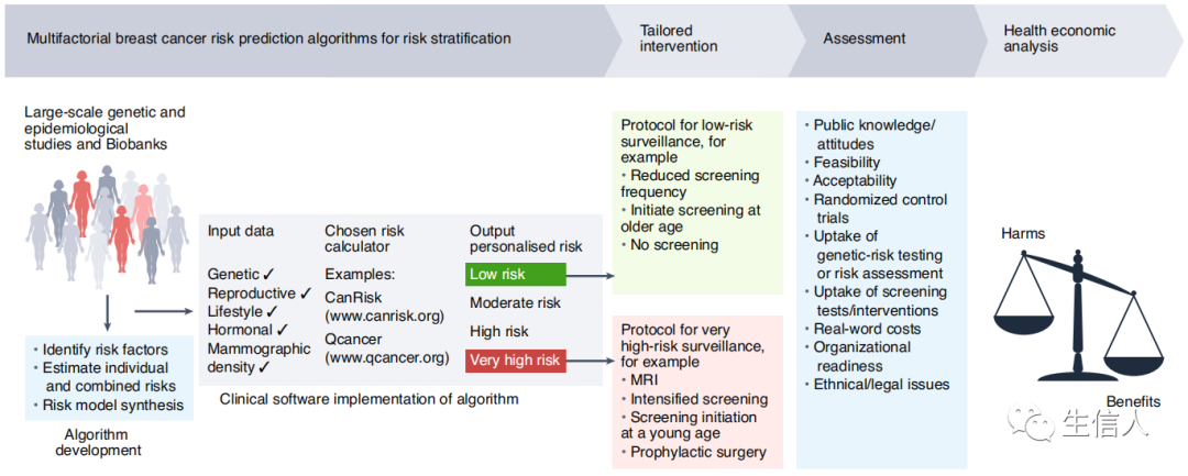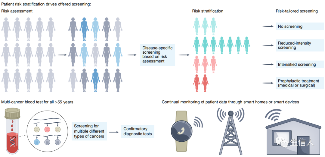 肿瘤的早期筛查已经成为当今的重磅话题,包括 Science、Nature、Cell等期刊都发表了相关的重磅综述。 今天,我们以《Nature Medicine》 4月刊发的综述进行早筛研究的解读。 针对癌症早筛,其中即涉及的早筛技术,既包括了MRI,CT等基于影像的技术,也包括可穿戴设备等持续性的监控。其中,基于游离DNA的液体活检将着重介绍。 论文链接:https://doi.org/10.1038/s41591-022-01746-x 癌症早筛的依据与流程 之所以可以抽血验癌,其生物学基础在于癌症的根源在于细胞积累的突变,越是年老的细胞,越容易在复制过程中(因此年龄是癌症最大的风险因素),变为可转移的癌细胞,并进入血液中。 如果这样的细胞已裂解,那么称为cf-DNA,如果血液中的癌细胞是完整的,称为ct-DNA。液体活检所依赖的,就是这些游离的癌细胞中的突变。 图1:癌细胞的出现到转移的过程展示对于癌症早筛的应用流程,流程进行大人群队列,开发针对所有人的,基于基因型,临床数据,生活习惯的风险判别算法; 之后针对分辨出的高风险与低风险人群,开展有区别的癌症监控,对于根据人群普筛识别出低风险人群,可减少筛查频次,或在更晚年龄开始筛查,而对高风险人群,则正好相反。 之后根据监控措施的可行性,被接受程度评估干预的效果及其社会和经济影响。 图2:癌症早筛干预方案的全流程图针对健康人的癌症风险评估有哪些? 针对全人群的癌症早筛,目前成熟的方法包括针对乳腺癌的乳房X光检查,针对子宫颈癌的子宫颈涂片检查,以及针对肠癌的粪便免疫化学检测(FIT)。除此之外,更多的是基于胚系突变的检测,最广为人知的是对BRAC1,BRAC2及CDH1基因指示的癌症风险的检测,而近些年来发展更快的是使用多基因风险模型(PRS),预估癌症风险,该方法能够整合多个基因互作带来的影响,从而比基于少数基因的检测,更具发展潜力,随着大人群数据(例如UK biobank及CKB等)的积累及AI算法的成熟,将会变得更为准确。 针对特定实体瘤,还可收集组织样本进行检测,例如通过检测HPV病毒的型别,判定宫颈癌风险,该检测目前已相当成熟;使用粪便中的微生物组成及免疫化学检测,判定结直肠癌风险。基于血液的检测,主要检测特定蛋白,例如前列腺特异性抗原(PSA)以及乳腺癌标志物CA125,然而这些检测,都是针对特定的癌症。 液体活检之游离DNA检测 理想的情况是通过抽血或尿液检测所有类型的癌症,在这一领域中,发展最快的是游离DNA检测。假设一毫升血液中包含1000份长约100-200bp的癌细胞DNA片段,这加起来就相当于百万碱基的癌细胞DNA,如能检测其中的体细胞突变,就能提早发现癌症。然而该方法最大的问题在于信噪比。 据估计,在癌症中晚期,血液中游离的DNA会占10-20%,然而在癌症早期,血液中来自癌细胞的游离DNA成分,只有中晚期的千分之一。为此,需要采取超高深度的测序,以检测这些低浓度的游离DNA。 此外,正常的细胞在衰老过程中,也会累积突变,例如白细胞中的意义不明的克隆性造血(hematopoiesis of indeterminate potential (CHIP),指由一个造血干细胞或者其他早期的起始血细胞为了更好的适应环境而发展成一个带有一些基因变异的亚型,常见于白血病患者,也会出现在未患白血病的人群中,通过检测该类突变,可以较高的特异性,提示无症状癌症的风险。 液体活检方法的一个关键局限性是,在癌症中反复发生突变的基因数量非常低。即使对覆盖数百个基因的基因panel进行分析,大多数癌症也将只呈现少数突变。例如,一个为非小细胞肺癌开发的panel包括125kb的DNA序列,其区域包含超过500个基因,发现癌症样本中体细胞突变中位数为4个[1]。缺少重复发现的高频突变,使得模型难以制定明确的判别标准,即究竟需要多少标记物来检测早期癌症呢?一种筛选eb病毒(EBV)诱导的鼻咽癌(NPC)的方法为这个问题提供了一个很好的答案。病毒DNA可以以多个拷贝的形式整合到基因组中,从而增强信号。通过检测血浆中的EBV DNA,已经发现早期鼻咽癌可以被检测和治疗,从而降低死亡率。该综述的作者估计,需要对500种癌症特异性标记物进行分析,才能在其他实体肿瘤中达到类似的敏感性水平。 液体活检之表观信号检测 通过高深度,富集特定区域的重亚硫酸测序,检测甲基化信号,也是常见的肿瘤早筛方法,已在多种实体癌中应用。该方法对癌症患者的检出率很高,但对于早筛的帮助却还有待论证。目前最大的该类型项目,是总计14万人的随机临床实验,参考[2]。另一种检测表观信号的方式,是考察对游离DNA进行低深度全基因组测序时,DNA片段长度所展现的模式,该技术的原理是来自肿瘤细胞的游离DNA长度与来自正常细胞的不同,从而可用来进行癌症早筛。 所有基于表观遗传的检测方法,都面临一个共同的问题,即如何确保检测的信号来自癌细胞而非其它正常的或处在病变状态的细胞。因此这类检测在方法研发阶段,要考虑被试者是否患有基础疾病,例如糖尿病或慢性炎症。开展检测时也要排除可能的干扰因素,使得信号具有特异性。 需要注意的是,液体活检的结果不能作为诊断依据,但可提示传统检测方法无法检出的高危人群。最近的一项研究清楚地说明了这一点,在该研究中,对9911名健康妇女的血液进行了常见的生物标志物筛查,然后进行了诊断性正电子发射断层扫描-计算机断层扫描(PET)[3]。在研究期间发生的96例癌症病例中,单纯血液检测的阳性预测值为19.4%,PET-CT联合增
