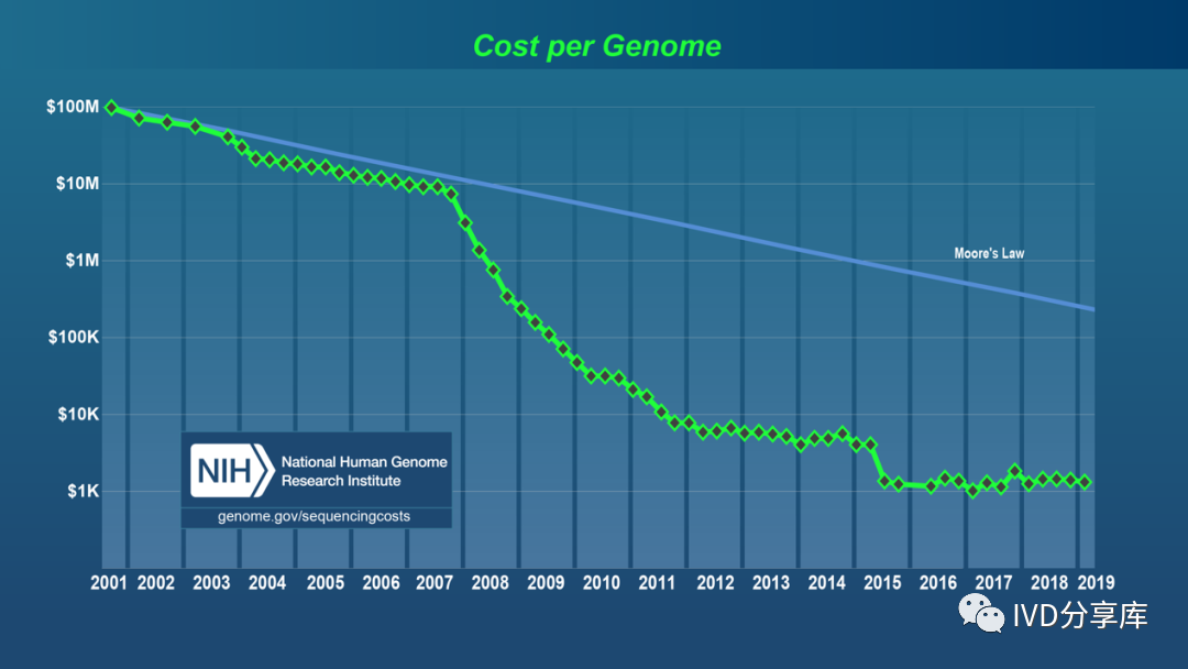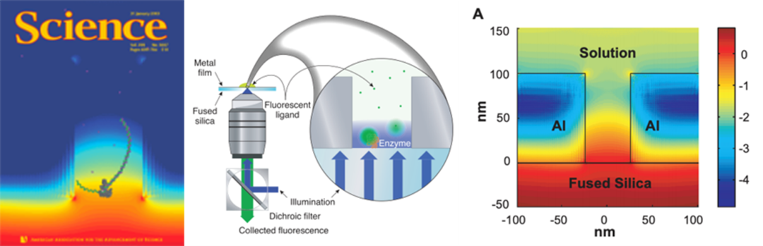 1959年的冬天,物理学家Richard Feynman在加州理工举办的美国物理年会上作了题为"There's Plenty of Room at the Bottom: An Invitation to Enter a New Field of Physics"的演讲,在这个轰动世界的演讲中,他向人们描述了一个奇幻的世界。在这个世界中,大英百科全书被记录在大头针的针头上;人们可以通过电子显微镜看到一个原子和DNA上突变的碱基;大量的信息可以存储在很小的空间里,字母可以用六或七位的字符表示..。这些预言在当代已经实现,他当时甚至还提出了要将计算机和晶体管等电子器件做的更小,还阐述了像光刻和蒸镀这种现代芯片的工艺技术的思路。 巧合的是,演讲的同一年,Mohamed Atalla和Dawon Kahng在远在东海岸的贝尔实验室中发明了金属氧化物半导体场效应晶体管(MOSFET),这是真正意义上的第一个可以微型化且批量生产的晶体管。从那年开始,晶体管被做的更小,更多的晶体管被集成在一个电路上。 1965年的春天,也就是Feynman演讲的6年之后,Fairchild Semiconductor和Intel的创始人,同在加州的Gordon Moore,提出了一个惊人的观点,他认为集成电路中晶体管的密度每年都会翻倍,晶体管的体积每年缩小一倍,并且这种速度会持续至少十年,十年后他将这个速度修正为每18-24个月,他修正后的观点神奇地预测了历史,即为著名的摩尔定律。在摩尔定律自我预言实现的驱使下,集成电路微处理器的性能不断翻倍,且伴随着价格的快速下降,晶体管的尺寸下降到了微米甚至纳米级。1988年秋天,一个名为“分子电子器件”的特殊会议召开了,在这一年的早些时候,Aviram详细的描述了一个理论上摩尔定律下晶体管微型化的最终目标 – 单分子晶体管,因为单个分子构成了可想象中的最小的稳定结构,在这个会议上,科学家们提出了各种各样的单分子所构成的电子器件的设想,讨论着摩尔定律未来的终局。可以说,摩尔定律指导了人类在半导体行业的长期规划和研发目标的设定,在我们的生物科技领域,摩尔定律也同样指导了一个无比重要的研究方向 – 下一代测序技术(next-generation sequencing),也就是我们常说的NGS或二代测序技术。 同曼哈顿原子弹计划和阿波罗计划并称为三大科学计划的人类基因组计划(Human Genome Project)于1990年在全世界范围内展开了,它被誉为生命科学的“登月计划”,历时十三年耗资30亿美金,测序工作的完成解开了人体内2.5万个基因的30亿个碱基对的秘密,但当我们把图谱和花费联系到一起时,发现平均检测1个碱基需要1美元,这个成本成为了个体化常规化基因组测序不可逾越的鸿沟。 在人类基因组计划接近尾声的时候,科学家们开始讨论如何将基因组测序的时间缩短,成本降低。2002年波士顿的GSAC会议(The Genome Sequencing and Analysis Conference)的开幕演讲中,包括George M. Church等基因测序的先驱们发表了名为“The Future of Sequencing: Advancing Towards the $1000 Genome.”的演讲,这一演讲明确了人类向1000美元测序时代冲刺的决心,两年后美国人类基因组研究所(National Human Genome Research Institute)提出了推动突破性测序技术发展的特殊计划,我们很有幸也参与其中。 当时参与这个计划的几个团队都不约而同的想到了同一个方向 – 单分子测序,同单分子晶体管一样,对单个核酸分子测序是可想象的最小成本、最短时间的测序方案,以往的测序方案都需要做PCR扩增,且重复地测同一个序列,在当时的实验能力与原材料产能不足的情况下,测序的成本很难被降低。在单分子测序的方向中,产生了几个著名的商业化公司,也都采用了不同的很有趣的测序方法。 Helicos的创始人之一Stephen Quake,是瀚海基因创始人贺建奎博士做博士后时的导师,公司的Helicos Genetic Analysis Platform是第一个通过对单个DNA分子成像来实现基因测序技术的仪器。Helicos也是采用边合成边测序(Sequencing by Synthesis)的方法,预先将多个单分子单链DNA固定在基底上,每次只添加一种有荧光标记的单核苷酸,通过聚合酶进行合成,在反应后直接显微成像,有荧光标记的分子被记录为完成了一个碱基的配对,不断地重复AGCT四种核苷酸的配对合成直到完成整条单链DNA的配对,如右侧图下面的表格所示,对记录的三条单链DNA分子不断重复后直接读出了连续的15个碱基序列。 在Helicos的设备中,一个关键技术是中间图所示的全内反射荧光(total internal reflection fluorescence)成像,因为麦克斯韦方程组对光(电磁波)的描述为连续方程,当光在两个不同折射率所形成的界面之间反射的时候,会沿着界面产生一个光的渐逝场,场强随着离开界面的距离指数递减,非常灵敏,且场的作用距离只有光波长的几分之一,将背景中的噪音降到最低,在当时Helicos商业化的设备中以这种结束通过物镜对样本的扫描可以在很大面积的基底上进行高灵敏度的单分子荧光成像,从而完成单分子测序。 2003年1月的Science杂志发表了一篇名为“Zero-Mode Waveguides for Single-Molecule Analysis at High Concentrations”的封面文章,文章中描述了一种可高平行同时检测单分子的动态过程的方法,这个装置实现方法非常简单,即在熔融石英表面上的金属铝镀膜中做出数十纳米的微孔的阵列,由于孔的直径小于入射光的波长,入射光主要的能量被限制在微孔的底部,无法传播出去,因此被称为零模波导,这种芯片器件能以微秒的时间分辨率研究微摩尔浓度下的单分子动力学。 Pacific Biosciences的创始人Stephen W. Turner等科学家研究了6年之后,