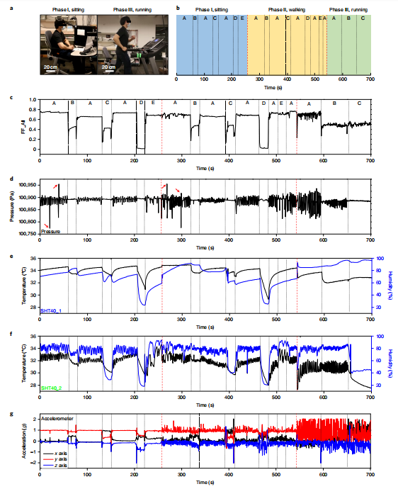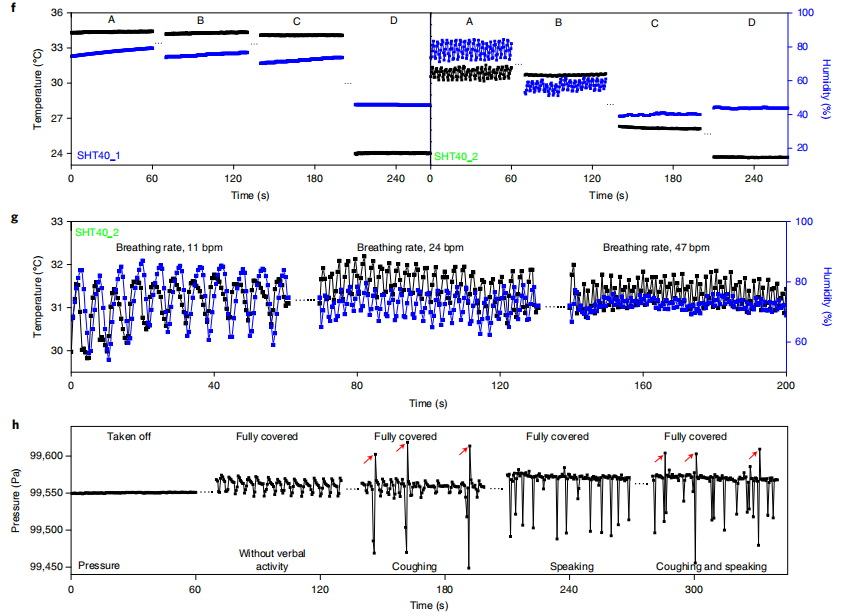 2019年新冠肺炎的出现以及世界各国政府随后推行的卫生政策突显了口罩在抗击传染病传播中的重要性。口罩长期以来一直用于医疗保健,但是,公共部门向佩戴口罩的过渡遇到了众所周知的合规性和有效性的挑战。特别是,许多人报告说口罩不舒服或令人窒息,这迫使他们摘下口罩以改善呼吸。然而,戴口罩只有在正确佩戴口罩并且紧紧覆盖面部时才有效。 面部特征的变化也会妨碍口罩的正确佩戴,尤其是对于女性、面部较小的年轻人和留胡子的男性。目前,口罩主要设计用于医院空调环境和胡子剃得干干净净的男性用户。这种受控的条件和环境是普通市民无法获得的。相反,为更广泛的公众设计更好的口罩需要更好地理解与口罩不合规相关的因素,以真实场景下用户的反馈和数据的形式收集,同时直接向用户提供实时贴合质量反馈也很有价值。 近日,来自美国的一个研究团队在杂志Nature electronics杂志上发表了一篇题为“A conformable sensory face mask for decoding biological and environmental signals”的文章。在这篇文章中,研究团队报道了一种可与商用面罩集成的适形多模态感官面罩(conformable multimodal sensory face mask, cMaSK),用于监测与传染病、环境条件和面罩佩戴状态相关的信号。设计包括实现低功耗操作的组件和固件,具有蓝牙低能耗的微处理器,以及与面罩集成的印制电路板(PCB)。薄粘合层允许集成系统与各种商用面罩(如外科口罩、N95口罩和棉口罩)反复粘合和分层。还开发了一个移动应用程序,通过蓝牙无线连接到cMaSK,并将数据传输到服务器进行数据存储和分析。 图片来源:Nature electronics 主要内容 cMaSK设计概述 下图显示了本研究的总体概念。cMaSK可以很容易地连接到各种面罩上,并且可以收集环境和生物信号。收集的数据通过蓝牙通信传输到定制的移动应用程序,并发送到服务器进行数据存储和管理。设计cMaSK时的四个要求:(1)应选择合适的传感器组件并将其放置在最佳位置;(2)cMaSK不应妨碍呼吸或影响面罩的佩戴和防护质量;(3)cMaSK应多次可逆地粘附在面罩上或从面罩上分离;(4)整个系统必须具有机械耐久性。 cMaSK由两部分组成:(1)f-PCB厚度为100 μm,与口罩进行交互;(2)控制整个设备操作的主PCB(m-PCB)。使用可充电锂电池,cMaSK可以运行超过60小时。 cMaSK设计概述。图片来源:Nature electronics 用cMaSK进行口罩贴合度测试 为了研究cMaSK对面罩性能的影响,研究团队使用了面罩贴合测试。结果显示了带有或不带有cMaSK的面罩的面罩贴合度(环境中和面罩内部的颗粒浓度之比),显示出几乎相同的值。这些数据表明,由于cMaSK的薄而适配的几何形状,它可以应用于各种类型的面罩,而不必担心面罩性能的恶化。 cMaSK的体外表征结果。图片来源:Nature electronics cMaSK的传感性能表征 cMaSK含有17个电容传感器。cMaSK可以通过电容传感器垫来检测口罩贴合度的变化。当面罩完全覆盖面部时,电容数值最高,因为当cMaSK完全覆盖鼻子和嘴时,接触皮肤的电容传感器垫最多。cMaSK还设置了空气压力传感器。当cMaSK完全覆盖时,因为呼吸运动,空气压力值有几十帕斯卡量级的波动。然而,当面罩未正确佩戴时,压力传感器无法检测到这种呼吸模式。另外,cMaSK不仅可以测量皮肤温度,还可以检测呼吸引起的温度和湿度变化以及各个方向上的加速度。 当cMaSK未正确佩戴时,呼吸引起的波动变得更弱,甚至消失(下图)。传感器表征结果验证了cMaSK可以基于这些多模态信号对面罩的佩戴位置进行分类。此外,通过计算温度、湿度和气压的波动次数,可以高精度地识别呼吸频率,甚至可以在说话时检测咳嗽。因此,研究团队验证了cMaSK可以监测与传染病相关的关键生物信号,如呼吸频率、咳嗽和皮肤温度。 cMaSK在不同面部位置和各种言语活动下的体内表征。图片来源:Nature electronics 体内环境和生物数据记录操作 使用cMaSK进行了体内人体试验,以验证在进行各种活动时记录生物和环境数据的适用性和可靠性。体内测试结果显示,根据cMaSK的位置,无论活动类型如何,每个传感器值都显示出明显的差异。cMaSK可以在动态活动期间测量皮肤温度(图e),使用加速度计监测人类活动,确定语言活动(呼吸频率、咳嗽和说话),即使受试者正在进行各种身体活动(图d、f)。 人体试验还表明,cMaSK不仅可以在各种活动中监测环境和生物信号,还可以评估面罩贴合质量。结果显示,因为面部尺寸和形状的差别,女性受试者的外科口罩的贴合质量不足,尤其是在口罩的底部和侧面区域,拟合质量分别比男性受试者低80%和70%。 人体实验身体活动分析。图片来源:Nature electronics 使用cMaSK验证口罩配合质量改进 男性受试者的胡子和女性受试者口罩尺寸不匹配导至口罩贴合度差,这显著影响了口罩的功效。对一名戴不同尺寸外科口罩的女性受试者以及一名剃须前后的男性受试者进行了口罩贴合度改善分析。结果显示,当外科口罩尺寸减小时,女性受试者的口罩贴合度测试仪测得的贴合度增加。这些结果强烈表明,较小的面罩更适合面部特征较小的人,如女性和儿童。男受试者剃胡子后,cMaSK测量的口罩贴合度在外科口罩和N95口罩中均增加。 通过对男性和女性受试者的口罩佩戴改善情况的分析,验证了cMaSK可以评估每个人的佩戴质量和空气面罩泄漏情况,其趋势与传统口罩佩戴测试仪得出的趋势相似。 总结和讨论 研究团队报告了一种可连接到任何面