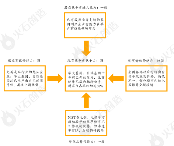 前言 随着三胎政策的推出,高龄产妇比例的增加,未来新生儿的数量将持续攀升,这对出生缺陷防控提出了新的挑战。目前基因检测技术已应用于孕前、产前和出生后各阶段,形成了以无创产前检测(No-Invasive-Prenatal-Testing,NIPT)为代表的相关产品和服务。随着检测技术的成熟,成本降低,监管环境的严格以及龙头企业的先发优势,NIPT行业红海格局已定。本文认为,提高市场渗透率,加快技术突破是未来扩大NIPT市场规模的主要途径。 无创产前检测(No-Invasive-Prenatal-Testing,NIPT)是一种利用高通量测序技术对母体血液中游离的胎儿DNA片段(cffDNA)进行测序,并解读胎儿遗传信息以进行相关疾病筛查的产前检测手段。通常用于鉴定胎儿是否存在21(唐氏综合征)、18(爱德华氏综合征)和13(帕陶氏综合征)三体异常。相较于传统检测技术如穿刺、超声、血清学唐氏筛查等,NIPT具有无创、检出率高、流产风险低等诸多优势,不仅扩大了检测时间窗口,安全性、特异性、敏感性也得到了大幅度提升。 来源:火石创造根据公开资料 1 无创产前检测发展现状 作为中国高通量测序(Next-generation sequencing technology,NGS)临床应用的第一站,NIPT的诞生和发展离不开NGS技术的不断成熟。NGS技术又称二代测序技术,可实现边合成边测序,适合大规模DNA样本。 自2005年以来NGS技术发展迅速,凭借高通量、低成本、测序时间短等优势成为了市场商用主流测序手段。目前NGS技术已应用于多个领域包括传染病诊断、孕产前检查及遗传病检测、肿瘤早筛和伴随诊断等。随着技术的持续更新和迭代,测序成本不断下降,远超摩尔定律速度。预计2022年成本将降低至300美金/每人,2024年有望实现100美金/每人全基因组目标。加上NIPT产品具有特殊性,涉及伦理、隐私和人类遗传资源保护、价格、质量等问题,整体监管环境跨越了自由发展、监管严格、试点准入、分业监管等阶段。 2014年2月,国家食品药品监管总局(CFDA)和国家卫生计生委联合发布《关于加强临床使用基因测序相关产品和技术管理的通知》叫停基因测序相关产品的临床应用,行业暂时进入了停滞期。而同年7月CFDA批准了BGISEQ-1000基因测序仪、BGISEQ-100基因测序仪和胎儿染色体非整倍体(T21、T18、T13)检测试剂盒(联合探针锚定连接测序法)、胎儿染色体非整倍体(T21、T18、T13)检测试剂盒(半导体测序法)的医疗器械注册,NIPT正式成为二代基因测序产品的新领地。 随着CFDA批准华大基因、贝瑞基因、达安基因、博奥生物等多家公司的NIPT产品,积极开展临床试点,行业监管逐步规范化。目前部分省份已经发文明确NIPT检测价格并积极将其纳入医保报销范畴,价格约在800-2400元之间,NIPT已进入大众价时代。 来源:美国国家卫生院 来源:国家卫生计生委、国家食品药品监管总局 来源:火石创造根据公开资料整理 NIPT产业链上游涉及测序设备和相关配套试剂,壁垒极高。尤其是测序设备,国内目前只有华大智造一家具备独立自主研发并实现量产的能力,其他企业主要通过贴牌或与国际巨头如Illumina合作开发。另外药监局要求NIPT产品上市后仍需提交至少10家临床机构、总数不少于10万例临床使用数据作为临床补充资料在产品下一次延续注册时提交。 截至2019年底,华大基因和贝瑞基因NIPT累计检测样本量分别达到600万例和350+万例,领先于其他厂商。同时贝瑞基因也成为了国内首例通过NMPA延续注册申请的厂家。设备的垄断加上临床数据的限制使得我国NIPT市场呈现寡头竞争。目前提供NIPT检测服务的企业主要有华大基因、贝瑞基因、博奥生物、安诺优达、达安基因等9家。其中华大基因和贝瑞基因凭借先发优势、丰富的临床数据积累以及自身技术和平台优势占据了绝大部分市场份额,市占率合计约为68%。这对有意布局该领域的企业而言进入难度较大,行业两强竞争格局已形成。 来源:火石创造根据公开资料整理 2 无创产前检测发展趋势 随着测序成本的降低,国内监管环境趋严,竞争格局逐渐稳定,我国NIPT市场已走向成熟。加之我国每年新生儿数量的持续下跌,市场增量空间较小。预计未来NIPT市场规模增长不明显,但渗透率仍有较大提升空间。根据智研智库和观研天下调查结果显示,2015年我国NIPT渗透率只有4.75%,2021年则上升至约50%,据国元证券测算2025年高龄产妇NIPT渗透率有望达到90%,非高龄产妇NIPT渗透率达至50%。因此市场未来的发力点在于存量的渗透率提升和增量的技术突破。 来源:火石创造根据公开资料整理 在渗透率方面,增加检测需求,扩大应用领域是主要驱动因素。我国已逐步放开二胎政策,鼓励三胎政策,这直接引起高龄产妇占比上升,预计2025年我国高龄产妇占比将达到26%,高龄产妇NIPT市场规模将扩大至38.61亿元。另外随着大众健康意识和风险意识的增强,非高龄孕妇NIPT渗透率进一步增加,预计2025年我国非高龄产妇市场规模将达到61.05亿元。因此未来NIPT应用领域呈现由高风险人群向普筛发展的趋势,非高龄产妇群体将成为NIPT市场增长的主要着力点。同时自2013年深圳率先将NIPT检测纳入医保后,2021年9月NIPT检测也正式纳入北京医保,医保支付政策的进一步鼓励和支持使得NIPT的医保覆盖将深入更多地区,未来三四五线城市将成为各家竞争的焦点。 在技术突破上,部分企业积极布局上游测序设备的开发,有望打破上游市场的垄断局面。博奥生物、安诺优达和达安基因生产的测