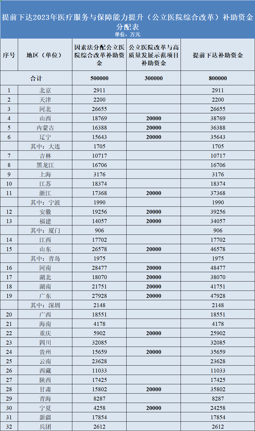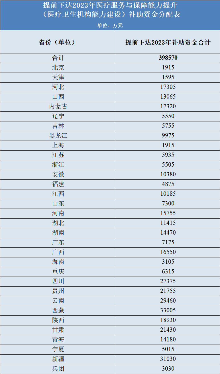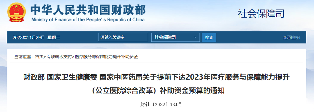 百亿财政资金提前下发,2023年公立医院诊疗能立建设,引爆新一轮采购需求。 119.8亿资金下发, 事关全国公立医院设备采购 11月29日,国家财政部社会保障司发布了《财政部 国家卫生健康委 国家中医药局关于提前下达2023年医疗服务与保障能力提升(公立医院综合改革)补助资金预算的通知》。 据补助资金分配表了解,本次国家提前下发的2023年公立医院综合改革补助资金共计共计80亿元。 其中,山西、内蒙、辽宁、浙江、安徽、福建、山东、河南、湖北、湖南、广东、重庆、贵州、甘肃、宁夏等15个省份,分别额外获得20000万元公立医院改革与高质量发展示范项目补助资金,合计30亿元。 除了提前下发的公立医院综合改革补助资金,国家财政部还提前下发了《2023年医疗服务与保障能力提升(医疗卫生机构能力建设)补助资金预算》。 据补助资金分配表,2023年第一批医疗卫生机构能力建设补助资金合计39.86亿元,其中,补助资金靠前的省份主要有新疆、西藏、云南、贵州、四川。 据《通知》了解,这两笔资金主要用于推进全国公立医院综合改革以及提升医疗卫生机构能力建设和服务水平。 而根据国务院办公厅发布的《关于城市公立医院综合改革试点的指导意见》,公立医院综合改革中还包括落实公立医院基本建设和设备购置,配备相应的大型医用设备。同时,文件强调,公立医院要优先配置国产医用设备。 毫无疑问,提前下发的百亿财政资金,全国公立医院医疗服务提升的同时,势必会带动相关医疗设备升级更新,利好所有医械人。 据此前文件了解,2022年提前下达的公立医院综合改革补助资金为79.8亿元,医疗卫生机构能力建设补助资金为48.4亿元,相比2023年,资金数量相差不大。 另外,本次提前下发的80亿公立医院综合改革补助资金中,特别划出了30亿元,重点支持支持公立医院改革与高质量发展示范项目。 今年3月,国家财政部发布了《关于组织申报中央财政支持公立医院改革与高质量发展示范项目的通知》,示范项目主要聚焦三大方面:提升市县级公立医院诊疗能力、加强智慧医院建设,以及控制医疗费用不合理增长。 其中,重点支持市县级公立医院传染病、精神病、急诊急救、重症医学、心脑血管、妇产科、儿科等临床专科建设,以及推进电子病历、智慧服务、智慧管理“三位一体”的智慧医院建设和医院信息标准化建设。 根据此前通知,每个示范项目中央财政补助不超过5亿元(其中10%的资金专门作为绩效奖补资金)。 毫无疑问,这30亿只是开始,随着项目的不断推进,将持续利好县级公立医院相关科室建设及设备采购。 附:县医院升三级必备医疗设备清单 |
