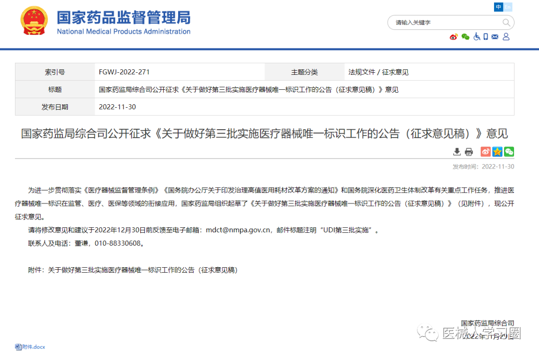 为进一步贯彻落实《医疗器械监督管理条例》《国务院办公厅关于印发治理高值医用耗材改革方案的通知》和国务院深化医药卫生体制改革有关重点工作任务,推进医疗器械唯一标识在监管、医疗、医保等领域的衔接应用,国家药监局组织起草了《关于做好第三批实施医疗器械唯一标识工作的公告(征求意见稿)》,现公开征求意见。