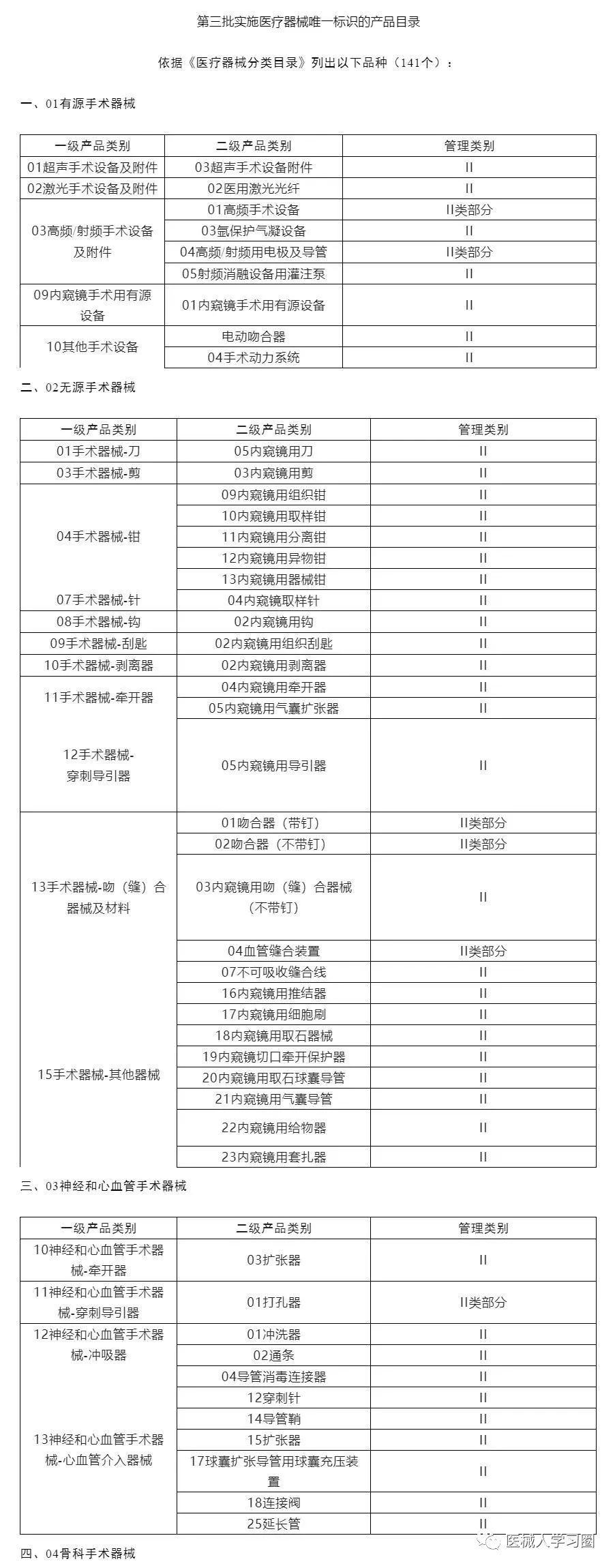 2021年1月1日,第一批9大类69个品种开始实施医疗器械唯一标识。2022年6月1日,其他第三类医疗器械(含体外诊断试剂)作为第二批实施品种全面实施医疗器械唯一标识。为进一步贯彻落实《医疗器械监督管理条例》《国务院办公厅关于印发治理高值医用耗材改革方案的通知》和国务院深化医药卫生体制改革有关重点工作任务,现将第三批实施医疗器械唯一标识工作有关事项公告如下:按照风险程度和监管需要,确定部分临床需求量较大的一次性使用产品、列入医保集采范围的品种、医疗美容相关产品等部分第二类医疗器械作为第三批医疗器械唯一标识实施品种,具体产品目录见附件。对列入第三批实施产品目录的医疗器械,注册人应当按照时限要求有序开展以下工作:2024年6月1日起生产的医疗器械应当具有医疗器械唯一标识;此前已生产的第三批实施唯一标识的产品可不具有唯一标识。生产日期以医疗器械标签为准。2024年6月1日起申请注册的,注册申请人应当在注册管理系统中提交其最小销售单元的产品标识;2024年6月1日前已受理或者获准注册的,注册人应当在产品延续注册或者变更注册时,在注册管理系统中提交其最小销售单元的产品标识。产品标识不属于注册审查事项,产品标识的单独变化不属于注册变更范畴。2024年6月1日起生产的医疗器械,在其上市销售前,注册人应当按照相关标准或者规范要求将最小销售单元、更高级别包装的产品标识和相关数据上传至医疗器械唯一标识数据库,确保数据真实、准确、完整、可追溯。对于已在国家医保局医保医用耗材分类与代码数据库中维护信息的医疗器械,要在唯一标识数据库中补充完善医保医用耗材分类与代码字段,同时在医保医用耗材分类与代码数据库维护中完善医疗器械唯一标识相关信息,并确认与医疗器械唯一标识数据库数据的一致性。当医疗器械最小销售单元产品标识相关数据发生变化时,注册人应当在产品上市销售前,在医疗器械唯一标识数据库中进行变更,实现数据更新。医疗器械最小销售单元产品标识变化时,应当按照新增产品标识在医疗器械唯一标识数据库上传数据。医疗器械注册人要切实落实主体责任,鼓励基于唯一标识建立健全追溯体系,做好产品召回、追踪追溯等有关工作。对于因《医疗器械分类目录》动态调整导至产品管理类别发生变化的情况,医疗器械注册人应当按照调整后管理类别的要求实施唯一标识。医疗器械经营企业要在经营活动中积极应用唯一标识,做好带码入库、出库,实现产品在流通环节可追溯。医疗机构要在临床使用、支付收费、结算报销等临床实践中积极应用唯一标识,做好全程带码记录,实现产品在临床环节可追溯。发码机构要制定针对本机构的唯一标识编制标准及指南,指导医疗器械注册人开展唯一标识创建、赋码工作,并验证按照其标准编制的唯一标识在流通、使用环节可识读性。省级药品监督管理部门要加强唯一标识工作的培训指导,结合实施工作推进需求做好产品注册系统改造,组织辖区内医疗器械注册人按要求开展产品赋码、数据上传和维护工作,加强与辖区内卫生、医保部门协同,推动三医联动。省级卫生健康部门要指导辖区内医疗机构积极应用唯一标识,加强医疗器械在临床应用中的规范管理。省级医保部门要加强医保医用耗材分类与代码与医疗器械唯一标识的关联使用,推动目录准入、支付管理、带量招标等的透明化、智能化。