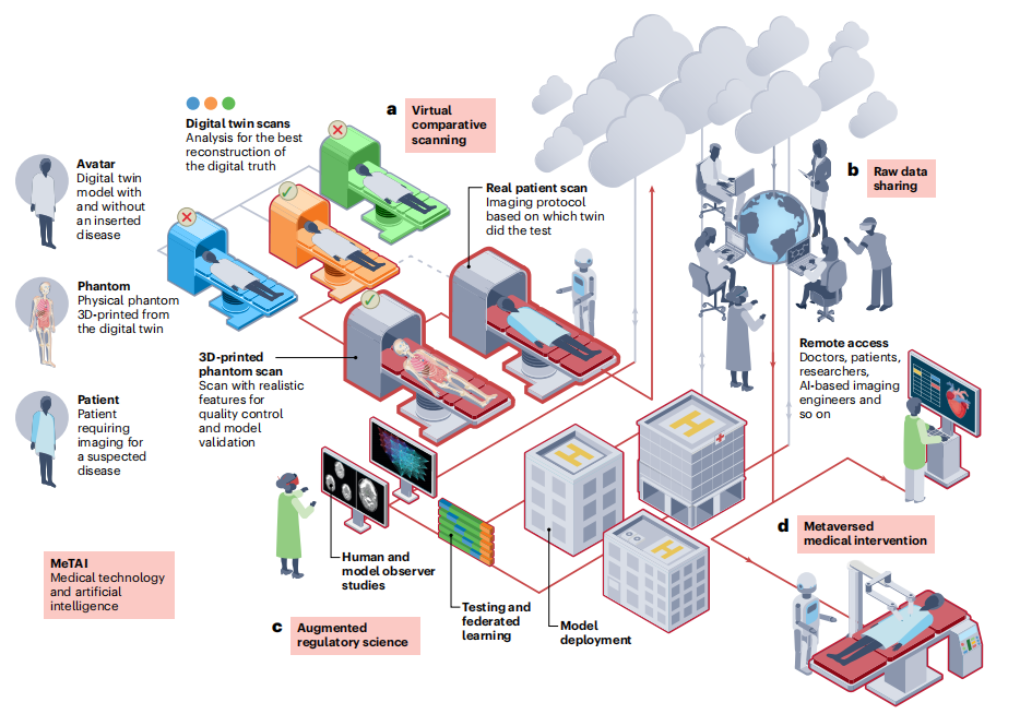 元宇宙融合了物理和虚拟现实,使人类及其化身能够在高速互联网、虚拟现实、增强现实、混合和扩展现实、区块链、数字孪生和人工智能(AI)等技术支持的环境中进行交互,所有这些都由有效的无限数据充实。元宇宙最近成为社交媒体和娱乐平台,但扩展到医疗保健可能会对临床实践和人类健康产生深远影响。 近日,来自美国的研究团队在杂志Nature machine intelligence上发表了一篇题为“Development of metaverse for intelligent healthcare”的文章。在文章中,作为一组学术、工业、临床和监管研究人员,研究团队发现了医疗保健领域元宇宙方法的独特机会。“医疗技术和人工智能”(MeTAI)的元宇宙可以促进基于人工智能的医疗实践的开发、原型设计、评估、监管、转化和完善,特别是医学图像引导的诊断和治疗。研究团队介绍了元宇宙应用,包括虚拟扫描、原始数据共享、增强的监管科学和元宇宙医疗干预。另外还讨论了MeTAI元宇宙生态系统的相关问题,包括隐私、安全和差异。以及还确定了协调努力的具体行动项目,以构建MeTAI元宇宙,提高医疗质量、可及性、成本效益和患者满意度。 图片来源:Nature machine intelligence 一、MeTAI元宇宙概念 元宇宙是“一个计算机生成的环境,用户可以在其中与他人及其周围环境进行交互,一个虚拟世界”。元宇宙经常被误传为仅仅是计算机游戏和社交媒体的延伸。为了充分体现其好处,元宇宙需要整合所有支持技术的能力(包括5G/6G、VR、AR、混合现实(MR)、扩展现实(XR)、数字孪生、触觉、全息、安全计算和人工智能(AI)),使人们能够在自己之间以及与化身、AI和算法以及医疗设备和设施进行交互。这里设想了一个“医疗技术和人工智能”(MeTAI)生态系统,如下图所示,包括关键要素,如在患者化身上使用数字孪生扫描仪进行虚拟对比扫描、安全医疗数据访问(包括原始断层图像数据共享)、适应这种转变的增强监管框架,以及“元宇宙”医疗干预,以实现前所未有的可及性和卓越的性能。 MeTAI生态系统医疗保健应用。图片来源:Nature machine intelligence 二、MeTAI应用程序 鉴于元宇宙可以在医疗保健领域发挥革命性的作用,确定了四个重要的应用,重点是医学成像,它们是MeTAI的例证:虚拟对比扫描、原始数据共享、增强的监管科学和元宇宙的医疗干预。 虚拟对比扫描 人体和机器的先进计算机模型的不断发展,最终形成了数字孪生计算范式,将物理和虚拟物体的数据集成。为了进一步利用这些创新进行医学成像,需要构建虚拟断层扫描仪,具有可由扫描仪解析的解剖特性的个体化计算化身,以及AI支持的图形工具,以插入、删除和修改这些化身中的疾病。此外,可以3D打印和扫描物理化身,以模拟真实扫描并改进相关模型和分析。MeTAI部署的XR相比孤立XR的一个优势是基于大规模协作的工作流可用性,从而可以公平地比较和完善各种品牌的硬件和软件,并在患者和专业人员之间进行生动和及时的交互。 上述情况将带来明显的临床益处。凭借虚拟扫描功能,全面的性能评估将有力推动成像和AI技术的改进。最终的混合数据集位于云端,将支持更大的虚拟和混合临床试验,以评估成像设备和算法的准确性、鲁棒性、不确定性和通用性。最终,面临多种选择的患者将启动平行世界来评估其结果。 原始数据共享 医学成像数据的主要来源是医学断层扫描仪,它生成大量的多维测量值,并使用复杂的算法重建成图像。缺乏对断层图像原始数据(如CT正弦图)的研究访问一直是研究人员的一个长期问题,许多数据共享和开源的努力在许多情况下尚未获得太大的吸引力。从行业角度来看,共享测量数据的主要挑战是不愿意公开专有信息。例如,每个CT供应商都制定了自己的系统校准和数据校正方法。为了解决这些问题,需要学术和工业合作来定义数据共享和转换协议。 在MeTAI中,虚拟CT扫描仪可以扫描数字患者,以产生虚拟的“原始”数据。然后可以在虚拟数据和图像中执行AI分析。在不披露供应商特定敏感信息的情况下,此类真实模拟数据应比真实机器的原始数据更易于共享。MeTAI可以是一个很好的促进器,可以直接在数据和图像中对真实和真实模拟的原始数据进行基于深度学习的分析。 强化监管科学 去年,美国食品和药物管理局(FDA)发布了一项行动计划,旨在进一步监督基于AI的医疗器械软件(SaMD)。需要多样化、高质量和经济高效的大数据集来优化从数据采集、图像重建和分析到诊断发现的整个工作流程。在实践中,获取大型临床数据集的成本很高。在这种情况下,上述虚拟扫描将是非常宝贵的。作为数字孪生技术价值概念的证明,FDA的一个团队模拟了监管评估虚拟成像临床试验(VICTRE)研究,其中创建了2986名虚拟患者,以评估数字乳腺体层合成(DBT)作为乳腺癌筛查全数字化乳腺摄影替代品的性能,如下图。研究表明,模拟工具可能是成像设备监管评估的可行证据来源。 为了增加在监管提交中使用计算建模的信心,FDA发布了“评估医疗器械提交中计算建模和仿真的可信度”的指南草案。此外,FDA还启动了“医疗器械开发工具”(MDDT)计划。非临床评估模型(如动物或计算模型数据集)可被鉴定为MDDT。医疗器械供应商和开发人员可以在指定的环境中使用合格的工具来支持其产品的上市前审查,而无需进一步的验证证据。沿着这个方向,MeTAI可以更全面地从患者、患者化身
