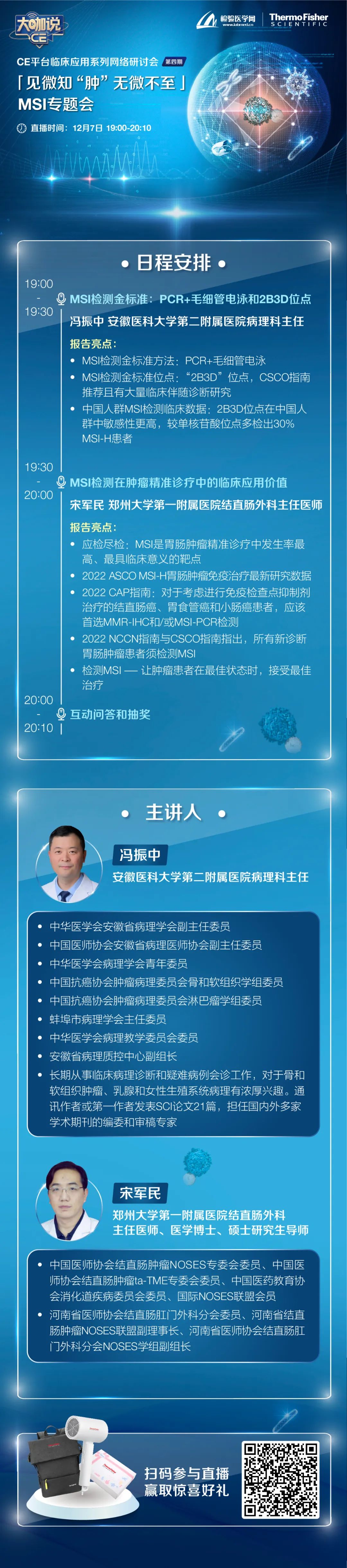 本次「CE平台临床应用系列网络研讨会」第四期,将重点介绍MSI的检测技术新进展及临床应用价值等热点问题,让MSI规范化检测更好地助力于肿瘤患者的精准诊疗。12月7日19:00,诚邀您参加本次网络研讨会!直播中更有多重好礼抽奖相赠,精彩内容不容错过!