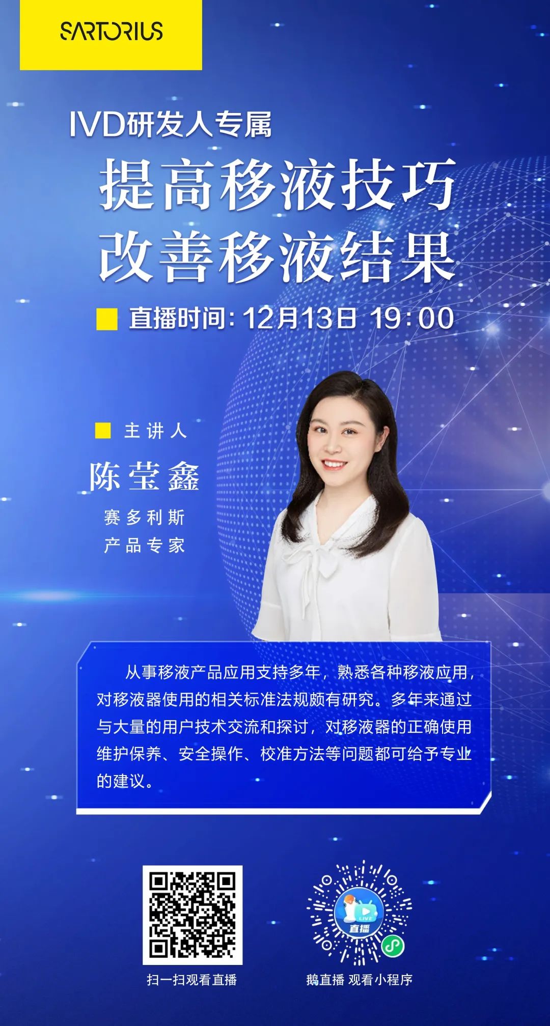 12月13日,小桔灯网联合赛多利斯开办一档 【IVD研发人专属】栏目,邀请业内资深研发专家分享实验室移液相关技巧、输出影响移液结果的具体因素、衡量移液结果的判断标准,并给出详细的解决办法和具体的操作步骤。期待与您共赴学习之旅!
