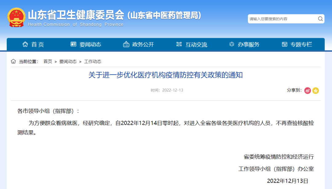 12 月 13 日,山东省卫生健康委员会发布《关于进一步优化医疗机构疫情防控有关政策的通知》,《通知》规定自 2022 年 12 月 14 日零时起,对进入全省各级各类医疗机构的人员,不再查验核酸检测结果。