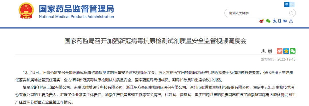 就在昨天,国家药监局也召开了加强新冠病毒抗原检测试剂质量安全监管视频调度会,加强新冠病毒抗原检测试剂质量安全监管!
