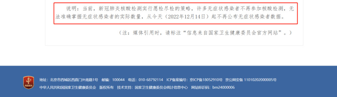 12 月 14 日,据国家卫健委官网,当前,新冠肺炎核酸检测实行愿检尽检的策略,许多无症状感染者不再参加核酸检测,无法准确掌握无症状感染者的实际数量,从今天起不再公布无症状感染者数据