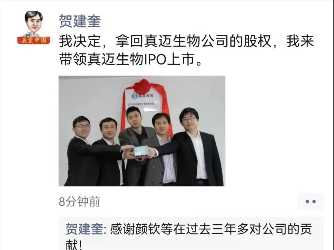 曾在12月12日,贺建奎朋友圈发布消息称:我决定,拿回真迈生物公司的股权,我来带领真迈生物IPO上市。同时也在评论区写道:感谢颜钦等在过去三年多对公司的贡献!