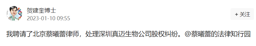 2023年1月10日,今日头条上贺建奎博士发布信息:我聘请了北京蔡曦蕾律师,处理深圳真迈生物公司股权纠纷, 并@了相关律师。