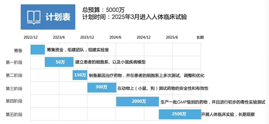 根据其微博透露的信息,贺建奎计划在2-3年内,攻克3-5种罕见病。其中杜氏肌营养不良(DMD)将是其第一个目标。他计划在2025年开展DMD人体临床试验,总预算为5000万。对于资金来源,他在微博表示,准备找马云、马化腾募捐10亿元。