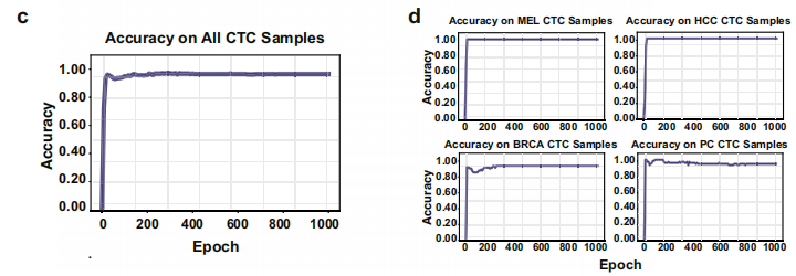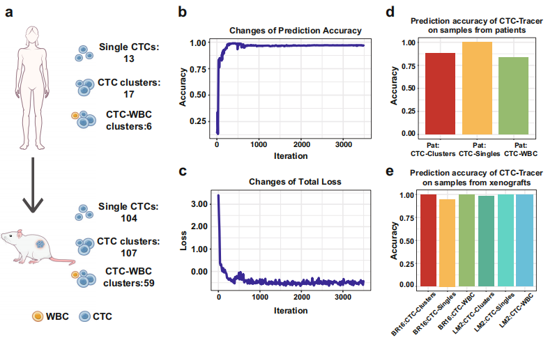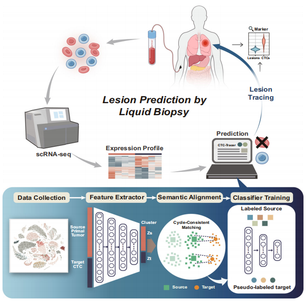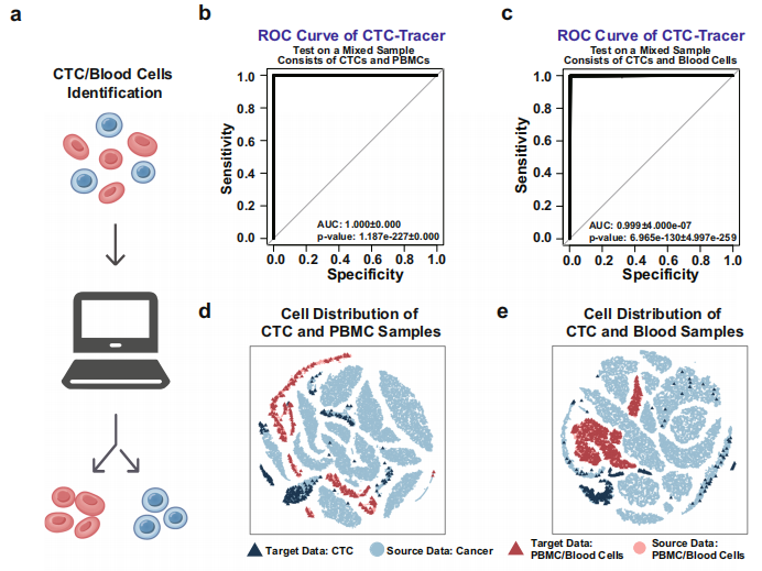 循环肿瘤细胞(CTC)是从原发性肿瘤和/或转移性病变脱落的细胞,是肿瘤的转移前体。CTC可以在整个疾病过程中从外周血中分离出来,是液体活检的重要目标。侧重于CTC识别和分析的液体活检有助于早期患者预后,可实时分析病变数量和位置,从而实现对肿瘤发展和转移的无创监测。然而,基于CTC的病变追踪需要CTC异质性的良好表征,以及参考数据集和新获得的CTC表征数据之间的有效数据映射。不幸的是,由于外周血中CTC的罕见,目前无法获得这些数据。CTC的识别、表征和大规模分析是具有挑战性的问题。 单细胞RNA测序(scRNA-seq)技术作为一种用于细胞分子异质性表征的有前途和强大的技术,已广泛应用于癌症研究,从而在肿瘤组织上积累了大量的scRNA-seq数据。基于这些单细胞表达谱图谱,可以通过有监督或无监督的学习策略实现癌细胞类型注释、癌病变注释和细胞组特异性上调/下调表达基因识别。由于CTC具有丰富的病理信息,将scRNA-seq分析整合到CTC研究中可以揭示更多关于病变的细节,从而提供对癌症的无创监测。特别是,CTC的单细胞表达表征提供了进行病变追踪的机会,并可能带来液体活检的新革命。 然而,由于缺乏CTC scRNA-seq分析领域的数据积累和先验知识,仍然难以从scRNA-seq组学数据中获取CTC的组织发生信息。考虑到CTC与原发癌组织分离,将CTC映射到原发癌细胞图谱是基于CTC的病变追踪的替代策略。尽管如此,CTC和原发癌细胞之间的差异构成了另一个挑战。对于无创病变追踪,仍然需要一种计算算法,该算法可以有效地将CTC上的scRNA-seq数据映射到来自病变的原代细胞的参考图谱。 近日,一组来自中国和澳大利亚的研究团队在杂志Nature Communications上发表了一篇题为“Deep transfer learning enables lesion tracing of circulating tumor cells”的文章,在文章中研究团队使用原发性肿瘤的大量scRNA-seq数据,介绍了一种称为CTC-Tracer的无监督深度迁移学习方法,通过将CTC的scRNA-seq profile有效映射到原发性瘤scRNA-seq profile,将从原发性癌细胞学习到的组织发生信息转移到CTC。从而,CTC-Tracer可以追踪CTC的原始病变,将CTC与背景细胞(如白细胞)区分开来,并发现CTC的基因标记。 图片来源:Nature communications 主要内容 深度迁移学习实现CTC的病变追踪 研究团队开发了CTC-Tracer,它采用迁移学习策略,有效地利用大型癌症单细胞图谱中的知识来追踪CTC的原始病变。具体而言,使用从血液样本中分离的CTC的scRNA-seq表达谱作为输入,CTC-Tracer被设计为准确识别CTC并追踪其病变的来源,还可以检测其相对于损伤病变细胞的表达变化(如下图)。 CTC-Tracer的主要功能及其应用概述。图片来源:Nature communications CTC-Tracer可实现从CTC鉴定到基因标记检测的完整CTC分析 大多数癌症患者的外周血中CTC的浓度非常低,在富集后,0至几百个CTC可能保留在1000至10000个背景细胞(主要是血细胞)中,这对后续分析(如病变追踪)构成了重大挑战。CTC-Tracer集成了一个CTC识别模块(图a),以区分CTC和血细胞,这将大大改善液体活检的临床应用。 为了验证CTC-Tracer识别CTC的有效性,研究团队发现CTC-Tracer在所有测试样本上实现了约99%的平均准确度。CTC Tracer识别PBMC数据集的平均AUC为1.000,识别血细胞数据集的AUC为0.999 (图b,c)。结果表明在不同的数据集和重复中获得了高精度,证明CTC Tracer可以有效地区分CTC和血细胞,并追踪CTC的原始病变。 不仅如此,CTC-Tracer还能够识别CTC中相对于其病变上调/下调的基因。总之,CTC Tracer是一种生物信息学工具,用于基于粗略捕获的CTC的scRNA-seq数据识别CTC、病变追踪和转移相关基因检索。因此,CTC-Tracer将大大促进液体活检的临床应用。 CTC-Tracer能够正确区分CTC和血细胞。图片来源:Nature communications 使用患者CTC scRNA-seq数据集评估CTC Tracer的病变追踪性能 CTC-Tracer是一种设计用于CTC scRNA-seq分析的算法,具有广泛的应用潜力。CTC-Tracer以病变追踪为中心,将作为无创肿瘤监测的基础。为了完全评估CTC Tracer的准确性,研究团队在8个独立的标准CTC scRNA-seq数据集上以直推或归纳学习模式对其进行了测试。 结果表明,CTC Tracer可以高精度地追踪CTC的原始病变,作为直推学习任务。为了评估从原发性肿瘤细胞到CTC的知识迁移中的性能,研究团队在来自不同研究的四个可用CTC scRNA-seq数据集上评估了CTC-Tracer的准确性。CTC-Tracer在CTC样本中获得了95%的平均标签预测精度(图c)。其中,CTC Tracer的平均准确率为100%(SD = 0.00),其中用于黑色素瘤(Mel)为100%,乳腺癌(BRCA)为92%和前列腺癌(PC)为95%。当使用四个独立外部scRNA-seq样本作为目标数据集时,CTC-Tracer在451个来自两种癌症(MEL和BRCA)的CTC中实现了约87%的准确率。 CTC Tracer可以有效地将CTC映射到原发肿瘤图谱。图片来源:Nature communications CTC-Tracer在CTC复杂RNA-seq数据集上的应用 研究团队进一步使用一个大而复杂的CTC数据集,该数据集包含117个单CTC、124个CTC-CTC簇和65个CTC-WBC簇的RNA-seq图谱,并对CTC-Tracer进行了测试。 首先在对来自BRCA患者的36个CTC对象(包括13个单细胞、17个CTC簇和6个CTC-WBC簇)应用CTC-Tracer,以完善模型。CTC-Tracer在这些样本中实现了高准确度(单个CTC:100%,CTC簇:88.24%,CTC-WBC簇:83.33%,图a–d)。进一步测试来自异种移植物对象上的模型准确性,并同样获得了高精度(BR16:单个CTC:94.87%,CTC簇:100%,CTC-WBC簇:100%;LM2:单个CTCs:100%,CTC簇:98.04%,CTC-WC簇:100%。图e)。 CTC Tracer在CTC-WBC簇上表现出优异的性能。所有这些结