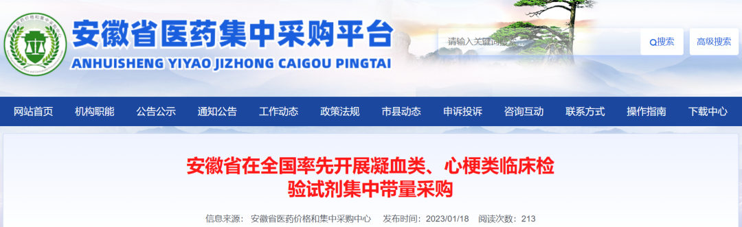2023年1月,安徽省医保局在全国率先完成凝血类、心梗类临床检验试剂集中带量采购。凝血六项共22家企业参加,16家企业产品拟中选,平均综合降幅40.16%,最大综合降幅为49.59%心梗类三项26家企业参加申报,17家企业产品拟中选,平均降幅57.35%,最大降幅80%,两类产品预计每年可为医疗机构节约采购资金8709万元。