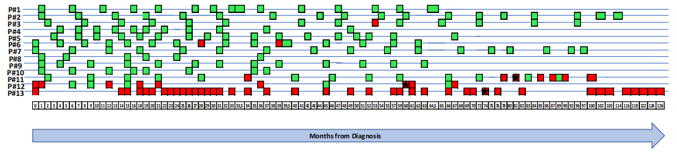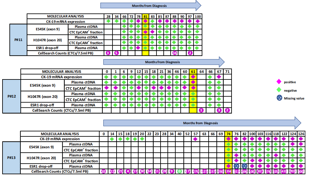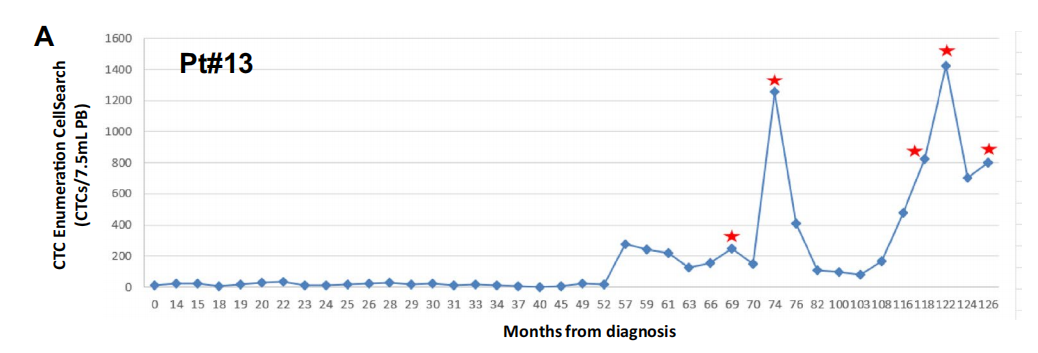 微小残留疾病(MRD)检测和监测对于实体瘤患者的管理仍然是一个巨大的挑战。根据肿瘤类型和分期的不同,相当多的癌症患者在原发肿瘤切除后五年内发生转移。在ER(+)乳腺癌症中,经过5年的辅助内分泌治疗后,乳腺癌症复发从5年到20年间持续稳定发生。这些乳腺癌症患者中,有很大一部分具有隐匿性微转移或MRD,在初始治疗后持续存在,这是随后远处转移复发的潜在来源。早期识别单个患者的MRD具有高度挑战性;为了实现这一目标,实时高灵敏度液体活检(LB)检测非常有前途,并为解决这一问题提供了巨大的潜力。 LB是一种微创方法,主要基于循环肿瘤细胞(CTC)和循环肿瘤DNA(ctDNA)的分析。LB是抗击癌症的重要工具,因为它能够实时监测连续样本中的肿瘤分子图谱。CTC分析目前是管理晚期和早期癌症患者的有力工具;尤其是CTC分子表征为更好地理解转移生物学和对特定治疗的耐药机制提供了独特的潜力。在癌症的早期阶段,CTC的检出率通常很低,并且具有高度的异质性。十多年来,在CellSearch系统中进行的CTC计数已被FDA批准为预后标志物,并与早期和转移性乳腺癌、转移性前列腺癌和结直肠癌的无进展生存率(PFS)和总生存率(OS)相关。除了CTC计数外,CTC在基因表达水平上的分子表征有可能阐明转移生物学中涉及的关键信号通路,甚至改善患者管理。RT-qPCR检测乳腺癌患者CTC中CK-19转录物在辅助化疗之前、期间和之后具有预后意义。CTC中PIK3CA的检测对患者的随访具有重要的临床应用价值。研究团队已经开发出高度敏感和特异的检测方法,用于检测早期和转移性乳腺癌患者EpCAM(+)CTC中PIK3CA热点突变(E545K,H1047R)和ESR1突变。 近日,一组来自希腊的研究团队在杂志Scientific reports上发表了一篇题为“Comprehensive liquid biopsy analysis as a tool for the early detection of minimal residual disease in breast cancer”的文章。在这项研究中,研究团队首次基于长期随访,对13名确诊为早期乳腺癌症的患者进行了全面的液体活检分析。分析基于CTC计数、CTC表型特征和CTC在基因表达、DNA突变和DNA甲基化水平的分子监测,以及相应的cfDNA突变和甲基化水平。结果表明,全面的液体活检分析为癌症患者的治疗管理提供了有价值和重要的信息,可以在出现临床可检测的转移性疾病和疾病进展之前几年揭示MRD的存在。 图片来源:Scientific reports 主要内容 一 CK-19 mRNA表达 在随访期间的不同时间点,评估了所有患者样本中CK-19转录物的存在(如下图)。在十年的随访中,十名患者未出现疾病进展,其中八名(8/10,80%)患者在所有时间点均未检测到CK-19转录物。另外两名患者(Pt#3、Pt#6)在1或2个时间点被发现CK-19转录物阳性。随访期间未出现疾病进展的所有10名患者中,仅在3/135(2.2%)个测试时间点检测到CK-19转录物。 相反,两名患者(Pt#11、Pt#13)在初始诊断后几年以及PD确诊和转移诊断前,CK-19转录本拷贝数显著增加。结果表明,在辅助治疗之前、期间和之后,在可手术乳腺癌症患者的外周血中检测CK-19(+)mRNA细胞是一个独立的预后因素,与疾病复发风险增加和生存期缩短相关。研究还表明,化疗完成后CK-19(+)CTC的存在与晚期复发风险增加和转移性乳腺癌生存率低相关。 EpCAM(+)CTC组分对CK-19 mRNA表达的分子分析。 图片来源:Scientific reports 二 DNA突变的检测 研究团队进一步分析了三名发生转移的乳腺癌症患者(Pt#11、Pt#12、Pt#13)血浆cfDNA和CTC-来源gDNA样本(如下图)。在所有测试时间点,发现Pt#12血浆ctDNA中ESR1突变均为阴性;该患者经历了内分泌治疗的临床客观反应,自诊断后61个月内,在分析时没有疾病进展。Pt#13在血浆ctDNA中ESR1突变呈阳性(如下图)。这名患者后来对内分泌治疗产生了耐药性。同时,PIK3CA突变分析结果表明,部分gDNA样品中PIK3CA热点突变呈阳性,为患者靶向治疗有着指导意义。 先前接受他莫昔芬或aromatase抑制剂治疗的患者中发现了ESR1突变,揭示了长期芳香化酶抑制治疗与ESR1突变的存在之间的可能相关性。获得性ESR1突变是芳香化酶抑制剂耐药性的主要机制。 P#11、P#12和P#13的CK-19、DNA突变、CTC计数和ctDNA的分子分析。图片来源:Scientific reports 三 Pt#13的综合液体活检分析 研究团队对Pt#13进行了综合液体活检分析。 CTC计数、表征和治疗干预:在随访期间,使用CellSearch系统在常规时间点进行CTC计数(如下图)。Pt#13CTC计数显示,即使在全身化疗开始之前,该患者的预后也很差,这是基于CTC数量相对较高。辅助化疗/放疗结束后,CTC数量都会有明显降低。根据CTC的表型表征进行一系列靶向治疗,CTC的绝对数量明显减少。在肝脏转移被组织学证实之前,患者的CTC持续阳性;CTC计数的急剧增加清楚地表明,在转移的影像学记录之前至少四年,疾病进展。 CTC计数结果(红星表示疾病进展的时间)。 图片来源:Scientific reports “ CTC和相应ctDNA的分子分析 CK-19 mRNA表达:在开始辅助化疗之前,在Pt#13的PB中未检测到CK-19转录物。患者肝脏转移确诊前8个月时,PB中观察到CK-19转录物。在疾病的转移阶段,所有CK-19转录物分析样本均为阳性。 DNA突变:转移的临床表现前一年,PIK3CA热点突变和ESR1突变在来自CellSearch的CTC来源DNA中,和在血浆cfDNA和EpCAM(+)CTC组分中连续检测到。在同一时间段,ESR1甲基化在血浆cfDNA和相应的EpCAM(+)CTC组分中检测到。这些结果表明,虽然CTC计数的增加表明转移扩散很早,但DNA水平上的CTC分子特征清楚地表明肿瘤已经对治疗产生了耐药性。 ESR1甲基化: 从EpCA