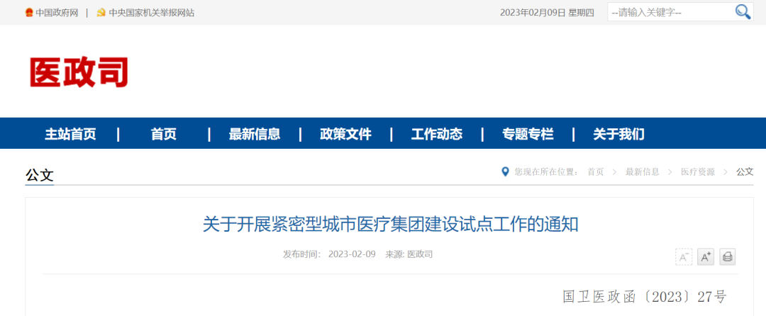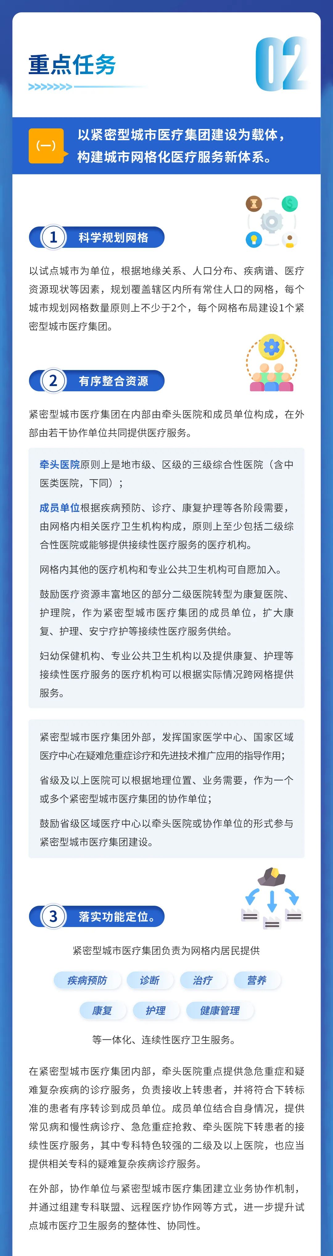国家一纸通知下发, 事关全国公立医院! 2月9日,国家卫生健康委、国家发展改革委、财政部、人力资源社会保障部、国家中医药局、国家疾控局等六部委决定在全国开展紧密型城市医疗集团建设试点,并印发了《紧密型城市医疗集团建设试点工作方案》(以下简称《方案》)。 这是由三级公立医院或能代表辖区医疗水平的医院(含中医医院)牵头,基层医疗卫生机构(区县医院、社区卫生院等)为成员的医疗联合体,为辖区居民提供预防、治疗、康复、健康促进等一体化、连续性健康服务。 集团内各医院不仅加强协作,同时还将带动基层医疗卫生机构服务能力和管理水平提升,实现优势互补,资源共享。 此前,成都等7个国家城市医联体试点城市共组建33个城市医疗集团,每个试点城市至少建成了一个具有明显成效的城市医联体。例如: