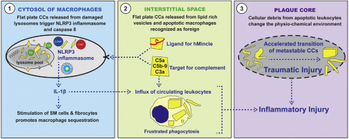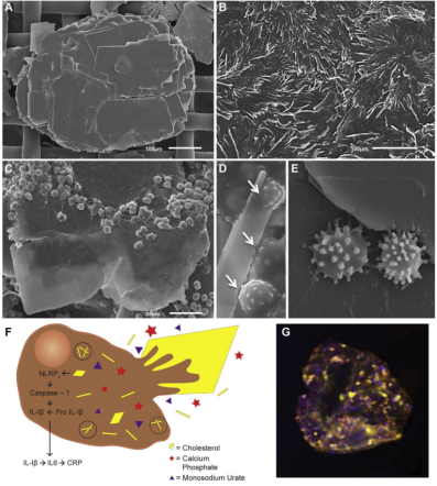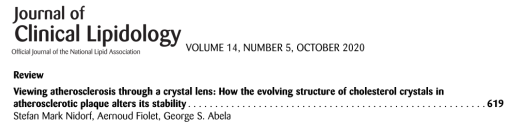动脉粥样硬化斑块中胆固醇晶体的变化 冯仁丰 最近,我又在美国的临床脂类学杂志中,看到了杂志上刊登的文章“通过结晶摄影观察动脉粥样硬化:在动脉粥样硬化斑块中胆固醇晶体的发展结构如何改变斑块的稳定性”。该文章介绍了很多的胆固醇晶体研究。 文章很长,还涉及了许多病理生理内容。我想借用临床脂类杂志的2020年,刊登的“通过结晶摄影观察动脉粥样硬化:在动脉粥样硬化斑块中胆固醇晶体的发展结构如何改变斑块的稳定性”,将里面多个图片,介绍给大家。这是在胆固醇结晶研究中,最著名的George S. Abela博士写的。 【摘要】 具有动脉粥样硬化病人中降低心血管(CV)事件的残余风险,依然是一个挑战。因此,理解胆固醇如何自发地自组装成亚稳定结构,涉及在动脉粥样硬化斑块内演变为平板胆固醇结晶(CC),以及为什么它们根本地改变了疾病的性质,提供了形成更多治疗的范例。特别是,平板CC,在巨噬细胞的溶酶体内,会成为大至去破裂溶酶体膜,导至组织蛋白酶B释放,和CC碎片直接进入细胞质。在细胞质内,平板CC的表面可以被complosome识别,与组织蛋白酶B一起,触发含有pyrin热蛋白结构域的炎性体。另外,细胞质内平板CC可被补体和在促炎症细胞上的补体和受体识别,较大的片段可诱导“受挫的吞噬作用”,从而使炎症损伤持续存在。此外,在富含脂类的斑块内,亚稳态CC快速转变为大平板CC,可通过斑块坏死核心的扩张,导至创伤性损伤,导至斑块破裂,可能引发进一步的炎症。斑块中的其他结晶,包括尿酸钠和磷酸钙的结晶,可以增强这些过程。因此,进一步限制胆固醇在血管壁上的沉积、减缓平板CC的形成,和抑制晶体诱导的炎症的治疗,可能会进一步降低已确诊CV疾病病人的风险。 尽管现有的治疗有效,但动脉粥样硬化二级预防治疗的最新进展,未能消除心血管(CV)事件的持续风险1-3。更多地了解如何导至发展血管壁(床)中游离胆固醇的积累,动脉粥样硬化斑块的进展和不稳定性,应为开发其他有效治疗策略提供更清晰的依据。 人们认识到,随着脂蛋白在动脉壁中堆积,它们在间质空间中聚集并形成囊泡4.5、或被隔离在巨噬细胞内,巨噬细胞转化为泡沫细胞、并协调持续的低级细胞反应。最终形成简单的纤维粥样斑块,其中含有细胞外胆固醇。有时候,包括中心粒细胞在内的循环白细胞,会被吸引到动脉粥样硬化床中,如果被激活,可能会对包括造成炎症损伤6。此外,通过生长胆固醇晶体(CC)导至斑块核心的快速扩张,可能导至外伤性损伤并甚至破裂7,8。虽然在动脉粥样硬化床中引发和维持炎症和创伤性损伤因子尚未完全确定,但越来越多的证据表明,主要是在常驻的巨噬细胞、间质空间、和富含脂类核心中形成的CC极大地驱动7-10这些过程(图1)。 图1 动脉粥样硬化包括中平板胆固醇晶体的影响。在巨噬细胞中,在溶酶体内的平板CC会大至破坏溶酶体膜,导至组织蛋白酶B(绿点)和CC片段世界释放到细胞质。在细胞质里,平板CC的表面可以被complosome(蓝点)识别,与组织蛋白酶一起会触发NLRP3炎症some。另外,细胞质中平板CC可触发细胞凋亡蛋白酶(红点),激发凋亡。在间质空间,从富含脂类的囊泡和凋亡的巨噬细胞释放的平板CC表面,促进了炎症伤害,由于它们被巨噬细胞的hMincle受体、和被增强炎症小体表达的补体因子C5c和C5b-9识别,促进了选择素的内皮表达,增强IL-1b的趋化作用,并增强循环白细胞的进入。 另外,没有被清道夫细胞摄取的大平板CC,可诱导受阻的吞噬作用,导至持续性炎症。在斑块核心,从凋亡白细胞释放的细胞碎片,可突然改变生理化学环境,加速亚稳态向大量平板CC的转变,导至包括的扩张、血管滋养管出血、和直接损伤,可导至斑块破裂或触发炎症,由于小的CC片段会暴露在间隙空间中。 “通过一个结晶摄影观察动脉粥样硬化”有可能看到,动脉粥样硬化斑块内胆固醇的演变性质,改变了疾病的行为。特别是,它协助解释了动脉粥样硬化斑块内在细胞内和细胞外的游离胆固醇,如何自发地自行组装为亚稳态的CC,为什么它们向平板结构转换易于导至炎症和创伤性伤害成为永久性风险。 图2 从亚稳态到稳定CC的过渡阶段。(图上端)在体外看到经数周形成结晶(分辨率10 μm)。(图下端)体内动脉粥样硬化兔模式内,胆固醇的骨架看来暂时演变为板状。每个阶段变化率受物理化学环境因素的影响。这是对组织进行扫描电子显微镜检查,无需遗传脱水避免溶解CC。相反,组织通过真空脱水,收缩为最小。 图3 结晶过程中胆固醇体积膨大,晶体穿透人冠状动脉和颈动脉的内膜。(A)胆固醇从液体中结晶后在试管边缘上方膨胀(体外)。(B,C)试管中的胆固醇(SEM为扫描电子显微镜)。(D,E,F)CC在试管口(分辨率5 μm)上的纤维膜进行评级。(G,H,I,J,K)为左冠状动脉前降支扫描电子显微镜(中间)低于斑块破裂点。可看到CC穿透内膜表面。(L,M,N)新鲜的颈动脉直接来自手术室,在37℃保存和检查,没有任何组织处理,展现了CC穿孔内膜与上述组织真空脱水的扫描电子显微镜图像相当。Bodipy C-12(invitrogen),一种绿色,对胆固醇具有亲和力的荧光染料,用于突出CC。 (注:图中黄色为胆固醇晶体;红五角星为磷酸钙;黑三角为尿酸钠)。Plaque Rupture:斑块破裂;Vasospasm血管痉挛;Myocardial Injure(心肌伤害)。 图4 与结晶有关的动脉伤害的多步骤概要。1)具有撕裂的纤维帽边缘被栓住的斑块破裂;2)释放的CC向下游移