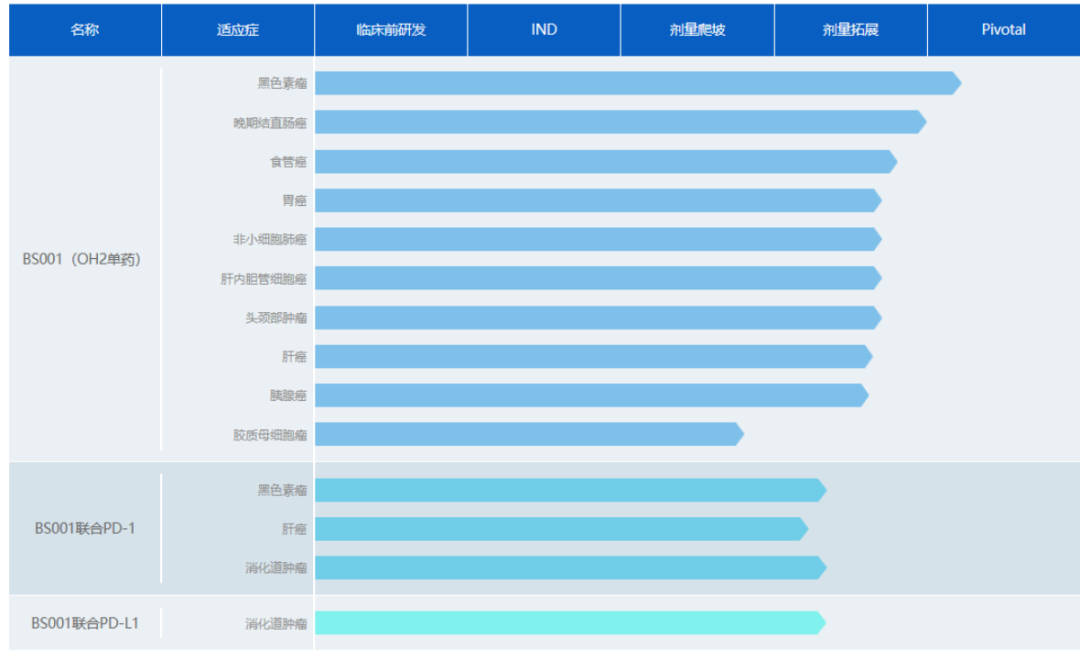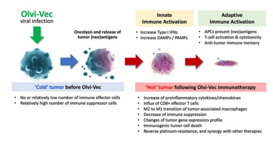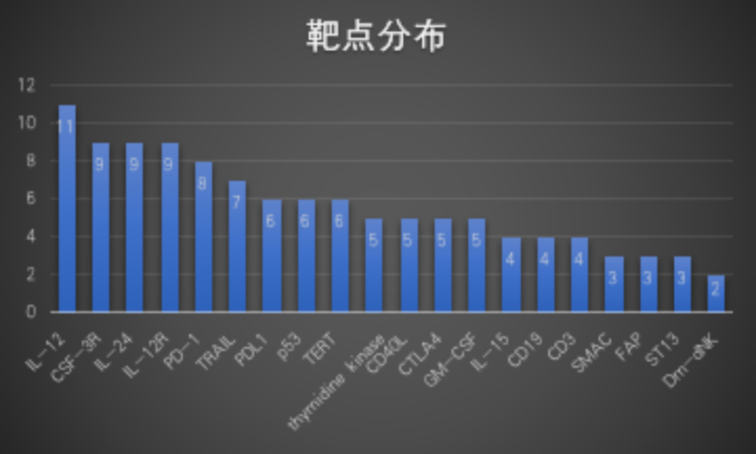 图注:靶点分布图(数据来源:智慧芽) 除上市药物以外,全球范围内处在III期临床及以上的药物共有9种。 溶瘤病毒的本质是一种具有复制能力的病毒,它可以在感染并裂解肿瘤细胞,诱导肿瘤细胞免疫原性死亡,改变肿瘤微环境的同时,不影响正常细胞。而现今的研究往往会通过基因修饰的方法克服天然病毒安全性问题、提高肿瘤选择性、改善病毒复制能力、限制病原性并且提高免疫原性。理论上,DNA病毒和RNA病毒都可成为候选病毒,但大部分的研究都还是会选择DNA病毒。 如前文所说,T-VEC是FDA批准的首个溶瘤病毒疗法,也是唯一受到广泛认可的溶瘤病毒产品。T-VEC由安进公司研发,是一种基于改良的1型单纯疱疹病毒(HSV-1)的溶瘤病毒疗法。该药物2011年获得FDA孤儿药资格,2015年10月27日经FDA批准用于不可切除的转移性黑色素瘤的治疗。 除遵循基本原理外,该药物内部包含可刺激免疫系统的GM-CSF编码序列,当注入相应位置肿瘤后,可以在肿瘤细胞中复制并裂解肿瘤细胞,使肿瘤细胞释放肿瘤相关抗原和GM-CSF蛋白,激发和加速抗肿瘤免疫应答。 3.1 安全性与剂量摸索试验①T-VEC的人体首次临床试验: 30名身患乳腺癌、头颈癌、黑色素瘤和结肠癌并且经标准治疗后疾病仍然进展的病人参与了该项研究。接受治疗的大部分病人只表现头晕、发热、恶心、寒颤、注射处疼痛的1-2级副反应,因此该药物的安全性得到了证实。 ②有效给药剂量如下:初始时,注射一剂106PFU/ml;三周后,每两周注射一剂108PFU/ml。不但如此,该试验还建立了以肿瘤体积为标准的药物体积滴定方法,该方法保证了注射药物的充分并且不会因为过量而从注射位点漏出,因此该方法在后续的临床研究中沿用。 3.2 黑色素瘤Ⅲ期临床显著获益在一项用于评估 OncoVEX^GM-CSF 与皮下给药 GM-CSF 治疗不可切除的 IIIb、IIIc 和 IV 期黑色素瘤患者的疗效和安全性的随机III期临床试验中,436名患者分为两组,分别在24周内进行28天为一周期的治疗,T-VEC组相对于GM-CSF组的疗效显著提高,DRR(16.3% vs 2.1%),ORR(26.4% vs 5.7%)。而T-VEC获批用于黑色素瘤就是基于这项试验所得到的积极结果。 3.3 令人振奋!三阴性乳腺癌(TNBC)或许从中获益!除黑色素瘤之外,研究人员正积极拓宽T-VEC的适应症。2月9日发布的一篇文章就带来了令人振奋的消息:T-VEC在TNBC的治疗上取得积极结果。在该项II期试验中,37名患者在手术前接受T-VEC联合新辅助化疗,其中45.9%(17/37)的患者治疗后获得完全缓解,要知道的是,这项数据在标准化疗的病人身上只有15%到30%。不仅如此,治疗后两年,89%的患者没有复发,与之产生强烈对比的是,只有60%的接受新辅助疗法的患者可以有两年的无病生存,且安全性与单用标准化疗没有显著差异性。 时下,TNBC的标准疗法为Keytruda与化疗的组合疗法,接受该疗法的三年无复发率约为84%,T-VEC标准化疗组合疗法竟也可以媲美,并且因两种疗法抗肿瘤免疫机制的迥异,且溶瘤病毒的肿瘤高度选择性,两种疗法的联合可能会为疗效和安全性增益。该文章通讯作者,莫菲特癌症中心乳腺癌医学专家Soliman博士表示:“我们的研究结果表明,当将T-VEC添加到全身化疗中时,可能会增加高风险、早期三阴性乳腺癌的反应。有证据表明肿瘤内有强大的免疫激活,因而有必要对T-VEC与目前的化学免疫疗法相结合对三阴性乳腺癌进行进一步研究。” 虽然这项试验展现了溶瘤病毒疗法在TNBC治疗上的潜力,然而值得注意的是,这是一项没有对照组的单臂试验,因此试验结果仍需通过大型的随机试验进行进一步的验证。 3.4 T-VEC联合治疗走向肿瘤治疗新高度Ovs的抗肿瘤机制与其他治疗方法迥异,且毒性作用有限,因此Ovs与其他治疗方法的有机联合成为未来溶瘤病毒研究与应用的一大方向。研究表明,溶瘤病毒可以作用于肿瘤微环境,促进PD-1和PD-L1的表达,逆转ICIs的耐药性。两药协同作用也在多种动物模型中得到证实。 在一项随即临床II期试验中,198名难治性黑色素瘤患者分别接受T-VEC+伊匹单抗或者伊匹单抗单药治疗。结果表明,联合治疗组相对于单药治疗组疗效明显提高,ORR(39% vs 18%)。联合用药相比于单药治疗的毒性也没有明显增加。 除此之外,T-VEC与放疗、化疗、靶向疗法、过继细胞疗法的联用也正处在如火如的阿研究当中,早期的一些积极结果也鼓舞了研发人员的士气,为溶瘤病毒未来的发展方向提供了巨大的可能性。 CG0070的研发是基于一种改造的5型腺病毒(Ad5)骨架,它包含一个肿瘤特异性启动子(E2F-1)和一个GM-CSF基因。目前该药物临床进展最快的领域为非浸润性膀胱肿瘤,其在美国、澳大利亚、日本、韩国、中国台湾均处在临床III期试验,而在中国大陆处在临床I期阶段。 该药物的出现可以很大程度上满足泌尿系统肿瘤的医疗需求。原研企业CG oncology也在2022年公布了一项CG0070 与 Pembrolizumab 联合用于对卡介苗 (BCG) 无反应的非肌肉浸润性膀胱癌 (NMIBC) 患者的 2 期单臂研究的中期结果(NCT04387461)。CG表示,在三个月的随访中,88%(28/32)的患者没有癌症进展迹象,一年内,86%(18/21)的患者对治疗有完全反应,且不良反应与单药使用相一致。CG更是因为这一结果获利,成功获得1.2亿美元融资,超过了其成立12年以来的融资总和。而现阶段进行的III期试验旨在评估膀胱内 (IVE) 给予 CG0070 对患有组织病理学证实的NMIBC患者的活性(这些患者患有芽孢杆菌 - 卡介苗 (BCG) 无反应性疾病,无论是原位