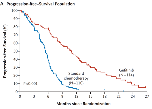 另一方面,从2004年开始,科研人员发现吉非替尼在某些特定人群中,比如亚洲人群或者非吸烟者人群,有更好的疗效。通过多年的不懈努力,科研人员最终发现吉非替尼的疗效和EGFR的基因突变有关。 并通过多项临床试验奠定了吉非替尼一线治疗在EGFR基因具有敏感突变的局部晚期或转移性非小细胞肺癌中的地位。2009年,欧盟批准易瑞沙用于EGFR突变的非小细胞肺癌的各线治疗, 2015年,易瑞沙又重新回到了美国市场。通过基因检测,将肿瘤病人在分子水平进行分型,可以筛选出药物治疗有效的病人。基因检测挽救了一个投入巨大的药物,更重要的是,给罹患肿瘤的患者带来了新的希望。