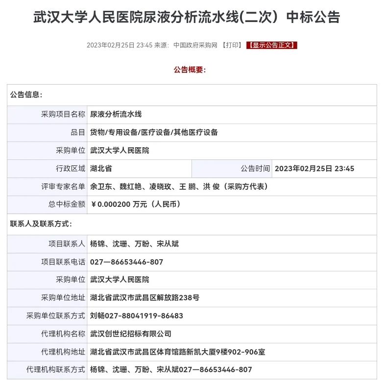 2023年2月25日,中国政府采购网发布,武汉大学人民医院尿液分析流水线(二次)中标公告。 一、项目编号:RMCG-22CSJ-H042/CSJ-1-2022-303(招标文件编号:RMCG-22CSJ-H042/CSJ-1-2022-303) 二、项目名称:尿液分析流水线 三、中标(成交)信息 供应商名称:九州通医疗器械集团有限公司 供应商地址:湖北省武汉市东西湖区长青街田园大道99号 中标(成交)金额:0.0002000(万元) 根据2月1日发布的招标文件,此次招标,预算70万,最高限价60万。 生化免疫流水线低价中标屡见不鲜,尿液流水线投出超低价不多见。 此前,财政部国库司发布《关于《中华人民共和国政府采购法(修订草案征求意见稿)》再次向社会公开征求意见的通知》。 具体包括,支持国产、分散采购取消“限额标准以上”的限制、取消“地方集中采购目录” “部门集中采购目录”的提法 ...同时,新增了“最优质量法”评审法、“创新采购”采购法、明确了“最低评审价法”的适用范围等内容。 第三十五条规定:技术、服务等标准明确、统一的通用货物、服务,已完成设计的工程施工,采用招标或者询价方式采购。技术复杂的大型装备,实验、检测等专用仪器设备,需要供应商提供解决方案的设计咨询、信息化应用系统建设等服务,创新采购以及政府和社会资本合作等项目,采用竞争性谈判方式采购。 随着意见稿的出台,新的招标采购法实施落地,将能有效解决最低价中标问题,是进一步完善市场环境,让企业拿产品质量说话,让过得硬的产品叫得响、站得稳,从而为制造业大国打下产品质量的基础。 |