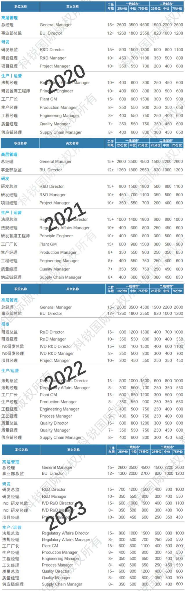 本次我们选择的是科锐国际2020-2023年发布的人才市场洞察及薪酬指南,建议不要纠结数据本身的准确性(毕竟小编的薪资从来没达到中位水平,哈哈,此处强行@小编HR),只要透过趋势变化能给我们带来一点点的启示,那就算咱们没白忙活。