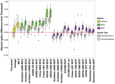 CC的白蛋白检测问题 冯仁丰 背景:血清和血浆白蛋白的检测被广泛地用于医学,包括在肾透析中心中病人护理质量的指示。 方法:收集没有肾病病人的血清(n = 50)、血浆(n = 48),肾衰病人血液透析前的血清(n =53)例。所有样品和ERM-DA470k/IFCC参考物质(RM),以3个免疫化学、9个溴甲酚绿(BCG)、和12个溴甲酚紫(BCP)方法检测。 结果:3个免疫化学程序的2个、9个BCG的5个、和12个BCP的10个方法,回收的RM值在它的不确定度内。一个免疫化学和3个BCG方法相对于RM值有偏移。所有检测程序的随机误差成分很小。选定Tina-quant免疫化学程序为参考检测程序,这是依据回收率和误差分析结果。BCG对于Tina-quant的平均偏移为1.5%到13.9%,在较低白蛋白浓度处更大。BCP方法的平均偏移为-5.4%到1.2%,无论白蛋白浓度。在所有方法类型中,血浆样品的偏移一般高于血清样品。对大多检测程序,进行血液透析病人相对于无肾病病人的血清,偏移较小。 结论:在免疫化学、BCG和BCP间显著差异,影响了血清白蛋白结果的解释。在临床管理肾病和其他疾病的指导和计算,必须考虑进行白蛋白检测的方法,直至实现一致性。 讨论 检验医学溯源性联合委员会(JCTLM)列出了依据免疫检测原理的透射比浊或散射比浊原理,去检出免疫复合物作为血清中白蛋白的一个RMP(20)。ERM-DA470k/IFCC被列为免疫检测校准的一个认证 RM。我们使用Tina-quant透射比浊免疫化学检测程序作为RMP,去确定检测程序和样品类型间的相对偏移,因为它在RM中具有出色的白蛋白回收,和很小的随机误差成分。在其他2个免疫化学方法间,Immage散射程序具有与Tina-quant详细的性能,但BN II对于RM值和Tina-quant程序,在所有样品类型中有显著的正偏移。这些观察隐含了BN II的校准是不正确的,使用一个免疫化学检测原理不可确保白蛋白的准确结果,除非校准溯源性被验证。 一般,BCG方法与BCP方法相比有较高的偏移。BCP方法对于RMP的平均偏移较小,并比例误差的大小不随浓度改变。相反,BCG方法对于RPM的平均偏移较大,呈比例误差随白蛋白浓度而异,在白蛋白较低浓度处有较大的正偏移。另外,在BCG方法与BCP方法间的比较,有较大范围的差异,说明BCG方法在很大程度上被其他样品中的蛋白或物质影响,超过BCP。 依据生物变异指标,在整个生理上合理的浓度范围,没有一个BCG方法符合偏移的最低性能规范。但12个BCP方法的8个符合了偏移的最低性能规范,没有这样的BCP方法的偏移通常比BCG方法观察到的要小。我们的数据说明,BCP方法对白蛋白有较好的选择性,具有比例偏移,看来结果的一致性可以达到。但是BCG方法随浓度变异的偏移和非选择性,隐含了实用BCG技术不可被一致,应从临床实验室中消除。 使用肝素处理的血浆的检测,在BCG方法中产生错误结果,已在以往报告中观察到(24,25)。本研究的的所有检测,除了Immage散射程序外,均被美国FDA批准,可使用血清和肝素化的血浆样品。我们的观察建议,特异性问题与肝素化样品有关,将继续是近期产生的BCG方法的问题。 24个检测程序中的19个,声明具有校准溯源性到ERM-DA470k/IFCC或它predecessor的ERM-DA470血清的RM。在实施校准溯源性做法中的差异,看来归因于偏移。但是肾病的还是非肾病的在血清或血浆间,结果的差异也支持了白蛋白方法,作为suffering因选择性的局限性,在样品类型间也不同。 血清和血浆白蛋白使用染料技术实现一致的结果,将要求规定单一试剂类型。我们的数据支持BCP作为优选的方法,因为相对偏移小于BCG方法,并在整个检验的浓度区间是恒定的,但BCG方法在整个浓度区间不呈比例的偏移,使得标准化不可能。 所有BCP和9个BCG方法的6个,回收ERM-DA470k/IFCC RM靶值很相似。病人样品和未稀释的和稀释的RM,免疫化学的和BCP对于RMP结果,具有类似的关系,看来RM适合用于这些方法。但是,稀释的RM结果在BCG方法,具有值得注意的不同关系,所以,稀释的RM会在BCG方法中,与病人样品不可互换。我们不知道,在校准溯源性方法中稀释了RM被厂商使用;如果使用了稀释的物质,BCG方法具有了互换性的问题。原先预期使用RM分析证书声明是,为校准免疫检测程序,包括关于对染料结合方法的minimal信息,建议了对特定检测程序使用应予以确认。需要进一步研究去确定RM为染料结合白蛋白检测程序的互换性特性。 白蛋白检测程序偏移的差异对病人诊疗有影响。美国的国家肾脏基金会关于慢性肾衰竭的营养指南(The National Kidney Foundation’s guidelines on nutrition in chronic renal failure) 建议进行肾透析病人的白蛋白常规检测(11,26)。在美国的Medicare和Medicaid服务中心,设定了透析病人护理的标准(27)。与前述指导(11)一致,目标(28)是:使用BCG方法检测的(或以BCG方法为(实验室正常的))白蛋白浓度≥ 4.0 g/dl(40 g/L)。 2016年,透析中心被预期,在38%治疗病人中达到白蛋白高于40g/L(29)。对血清白蛋白<35 g/L的病人,中心必须说明证据,计划改善营养。对于病人白蛋白低于该指导值的,应aggressive强烈补充蛋白(30)。补充会不利地影响无机磷、钾、和其他电解质,补充的费用和个人的时间通常nonreimbursable,还没有说明对明确的死亡率好处(31,32)。白蛋白检测没有标准化,使大量透析病人遭受未被证实和耗费治疗的风险。 白蛋白检测程序的选择,肾病样品百分数上产生了很大的差异,与本研究目标一致。BCG方法间,白蛋白目标是≥ 4.0 g/dl(40 g/L),以Advia 2400检测,有32%的样品符合,但以Architect 