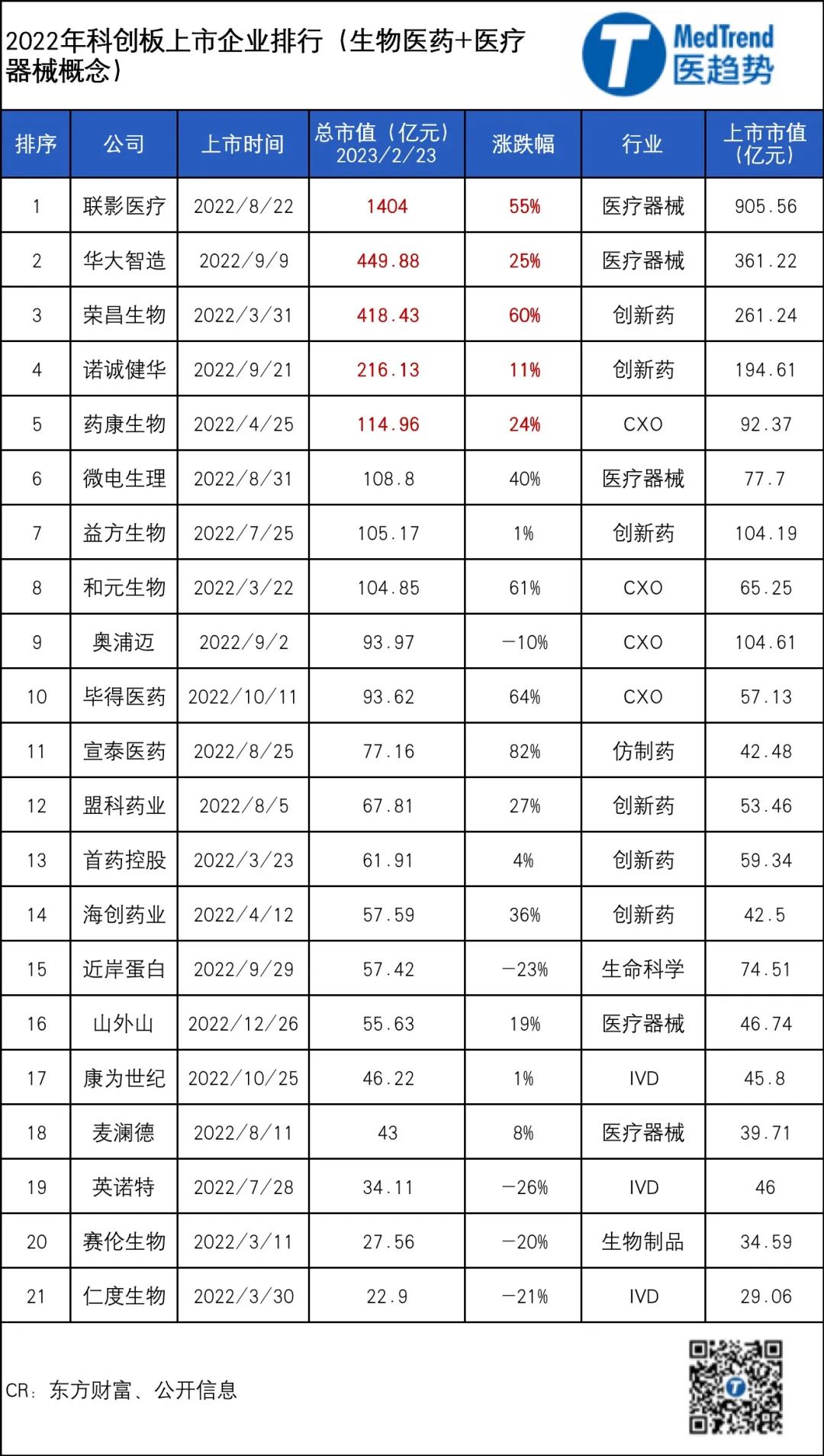 过去一年,共有21家医健公司登陆科创板。根据今日(2月23日)数据,市值前三名分别是联影医疗、华大智造、荣昌生物
