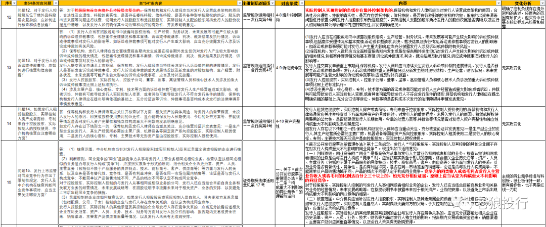 【前言】对投行从业者来说,老“54”条实在太过深入人心,非常有必要以老“54”条为准绳,逐条对比其中的差异,并将简化及删除的内容具体糅合到其他文件的出处也做个详细地阐述。本次修订,也体现了一些目前的审核重点: (1)紧跟注册制强调信息披露、强调针对性和重要性原则的原则,三大板块的规则进行了更新整合,部分较老的监管问答进行了与时俱进的修订; (2)整体的内容较原先进行了精简,部分简单重复或会计准则规定较为明确的简单问答内容进行了删除,如原问答27关于建筑企业工程施工的问题、问答29关于存货减值的问题等;部分已有相关文件规定的内容也进行了删除,如问题36关于主营业务3年内未变更的要求,实质已在《证券期货法律适用意见第3号》中进行了规定; (3)细化了经销业务核查的具体要求,新增的文字篇幅较大; (4)对一些财务处理实务中不够明确的问题进行了细化,比如股份支付的确认、等待期问题等。希望作者此文能对各位看官有所助益,不胜欢喜。 |