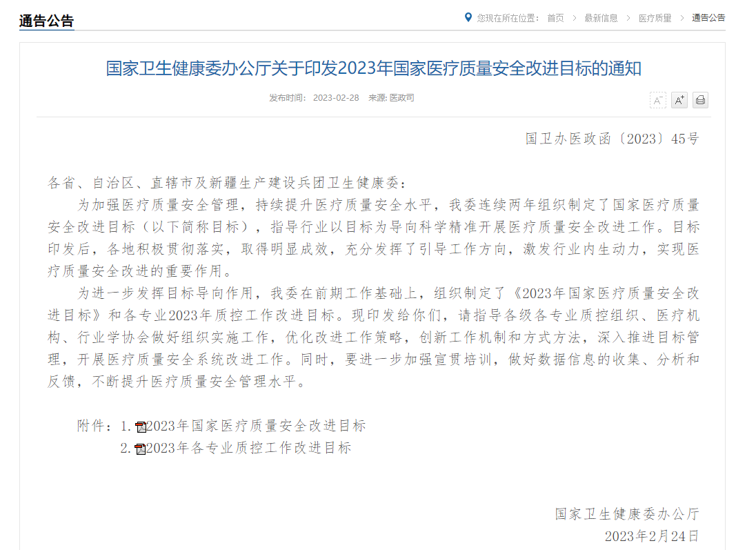 摘要: 国家卫生健康委办公厅关于印发2023年国家医疗质量安全改进目标的通知