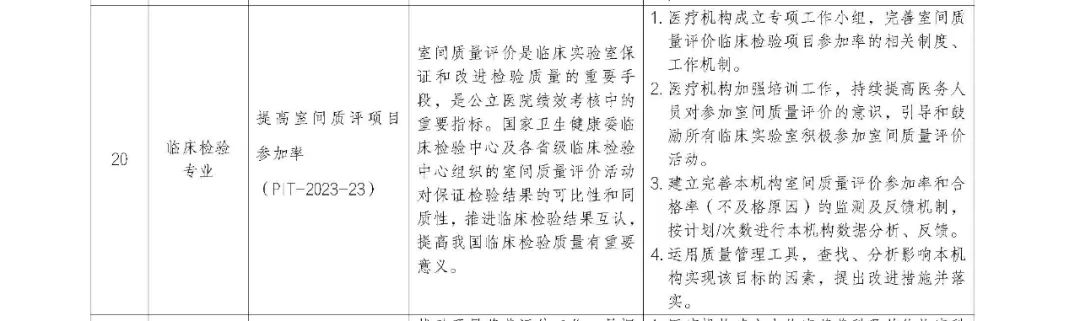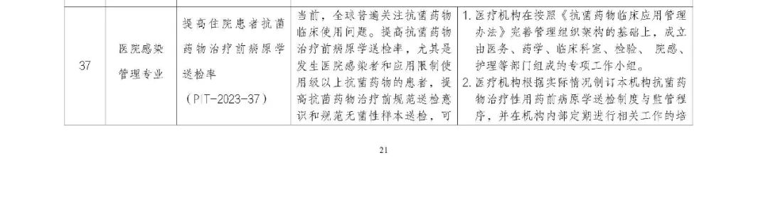 | 2月28日,国家卫健委医政司发布2023年《国家卫生健康委办公厅关于印发2023年国家医疗质量安全改进目标的通知》,明确提出:(1)感染科:提高呼吸道病原体核酸检测覆盖率和呼吸道感染性疾病核酸检测百分比。(3)医院感染控制专业:提高住院患者抗菌药物治疗前病原学送检率 (PIT-2023-37)(1)感染科改进目标:提高呼吸道病原体核酸检测覆盖率和呼吸道感染性疾病核酸检测百分比目标简述:呼吸道传染病是全球重大公共卫生问题,早期从发热和(或)呼吸道症状患者中正确识别并明确病原学诊断是呼吸道传染病防控的关键环节。医疗机构应当开展呼吸道病原体检测技术,医务人员应当熟练掌握呼吸道传染病的临床特点、标本采集和病原学检测技术。1. 医疗机构建立由医务、信息、检验、感染及其他相关临床科室组成的专项工作小组,并指定牵头部门,建立本机构工作和评价机制。2. 医疗机构参加国家和省级感染性疾病质控中心组织的统一培训,并重点加强对本机构感染、发热门诊等科室医务人员开展相关培训和考核,确保医务人员熟练掌握呼吸道传染病临床特点、送检标本类型和病原学检测技术。3. 医疗机构建立本改进目标数据采集方法和内部验证程序,按季度、分科室进行数据分析、反馈,纳入绩效管理,建立激励约束机制。4. 医疗机构运用质量管理工具分析影响实现该目标的因素,根据分析结果明确关键原因,制定改进措施并组织实施。目标简述:室间质量评价是临床实验室保证和改进检验质量的重要手段,是公立医院绩效考核中的重要指标。国家卫生健康委临床检验中心及各省级临床检验中心组织的室间质量评价活动对保证检验结果的可比性和同质性,推进临床检验结果互认,提高我国临床检验质量有重要意义。1. 医疗机构成立专项工作小组,完善室间质量评价临床检验项目参加率的相关制度、工作机制。2. 医疗机构加强培训工作,持续提高医务人员对参加室间质量评价的意识,引导和鼓励所有临床实验室积极参加室间质量评价活动。3. 建立完善本机构室间质量评价参加率和合格率(不及格原因)的监测及反馈机制,按计划/次数进行本机构数据分析、反馈。4. 运用质量管理工具,查找、分析影响本机构实现该目标的因素,提出改进措施并落实。(3)医院感染控制专业改进目标:提高住院患者抗菌药物治疗前病原学送检率 (PIT-2023-37)目标简述:当前,全球普遍关注抗菌药物临床使用问题。提高抗菌药物治疗前病原学送检率,尤其是发生医院感染者和应用限制使用级以上抗菌药物的患者,提高抗菌药物治疗前规范送检意识和规范无菌性样本送检,可以有效提高抗菌药物使用的科学性和规范性,对遏制细菌耐药、提升治疗效果和保障人民群众健康权益具有重要意义。1. 医疗机构在按照《抗菌药物临床应用管理办法》完善管理组织架构的基础上,成立由医务、药学、临床科室、检验、院感、护理等部门组成的专项工作小组。2. 医疗机构根据实际情况制订本机构抗菌药物治疗性用药前病原学送检制度与监管程序,并在机构内部定期进行相关工作的培训与再教育。3. 建立治疗性应用抗菌药物前病原学送检情况监测及评价机制,并将目标改进情况纳入绩效管理,建立激励约束机制。4. 运用质量管理工具,查找、分析影响本机构实现该目标的因素,提出改进措施并落实。5. 各级各相关专业质控中心开展宣传、培训、指导等工作,提高抗菌药物治疗前规范送检意识、规范无菌性样本送检。声明:本微信注明来源的稿件均为转载,仅用于分享,不代表平台立场,如涉及版权等问题,请尽快联系我们,我们第一时间更正,谢谢