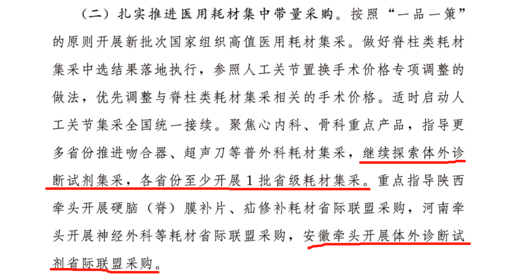 通知明确,2023年要扎实推进医用耗材集中带量采购,继续探索体外诊断试剂集采,并将由安徽省牵头开展体外诊断试剂省际联盟采购。