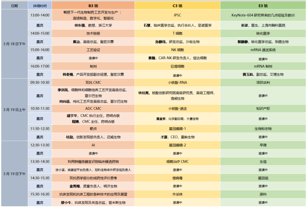 2023EBC第八届易贸生物生产大会暨易贸生物产业展览将于2023年3月17-19日在苏州国际博览中心隆重开幕,大会包含了技术服务、卓越品牌、原料/试剂/耗材、仪器设备五大展馆,聚焦IVD、抗体药物、细胞与基因治疗、核酸药物等多个热门赛道,聚集了众多生物医药企业的优秀人士一同进行深入分享、交流与合作。 主题报告:科学研究与产业转化 嘉宾:高 福,院士,中国科学院 嘉宾访谈 :聚力同行-2023中国生物医药产业展望 主持:王 越,常务理事,中国药品监督管理研究会 嘉宾:陈凯先,院士,中国科学院 魏于全,院士,中国科学院 邓子新,院士,中国科学院 张 伟,会长,中国药品监督管理研究会 单人Talk-创新与创业 嘉宾:余国良,董事长兼首席执行官,冠科美博 单人Talk-生物医药商业生态 嘉宾:陈智胜,CEO,药明生物 单人Talk-新技术新赛道 嘉宾:英 博,创始人兼首席执行官,艾博生物 单人Talk-从早研到营销:生物制药的全价值链商业化考量 嘉宾:张文杰,董事长、执行董事、首席执行官,复宏汉霖 双人对话-临床必杀技 嘉宾:李 进,教授,上海东方医院 双人对话-创业2.0 嘉宾: 王 晨,深蓝观创始人,赛柏蓝总编辑 双人对话-投资生态 嘉宾:蔡大庆,创始管理合伙人,夏尔巴投资 抗体药物研发工艺、临床-创新、开发、 商业化生产日程 专场冠名方:蓝晓科技 主持:李锦才,CEO,药明合联 主题报告:全球ADC概况-市场/项目/交易 嘉宾:胡奇聪,董事总经理,波士顿咨询 案例分享:本土企业的全球化开发 嘉宾:房健民,首席执行官&首席科学官,荣昌生物 主题报告:高品质层析介质赋能ADC药物发展 嘉宾:李延军,生命科学总经理,蓝晓科技 圆桌讨论:ADC产业化挑战:产线建设选择、分段式生产瓶颈 主持:李锦才,CEO,药明合联 嘉宾:房健民,首席执行官&首席科学官,荣昌生物 张连山,副总经理兼全球研发总裁,恒瑞医药 圆桌讨论:ADC领域商业模式探讨:技术合作、引入、出海 嘉宾:秦 刚,董事长,启德医药 刘东舟,首席科学官,华东医药 葛均友,CEO,科伦博泰 报告:CDMO 3-5年格局分析 嘉宾:余文心,医药行业首席分析师,海通证券 三人对话:中国生物医药行业的国际化布局策略 主持:余文心,医药行业首席分析师,海通证券 嘉宾:陈智胜,CEO,药明生物 圆桌讨论:CDMO扩张策略 主持:张江,创始人&CEO,LRI江远投资 嘉宾:贾国栋,总经理,和元生物 罗顺,董事长,澳斯康 孙秀莲,董事长兼CTO,宜明细胞 任科云,联合创始人&总经理,楷拓生物 圆桌讨论:Biotech转型CDMO策略:差异化竞争优势 主持:姜伟东,CEO,康抗生物 嘉宾:周凯松,CEO,夏尔巴生物 翁志兵,总经理,晟国医药 刘军,CEO,东曜药业 黄玮,首席运营官,复宏汉霖 论坛策划人:肖 申,首席战略官&首席医学官,思路迪医药 圆桌讨论:国际化对CMO工作的挑战 嘉宾:肖 申,首席战略官&首席医学官,思路迪医药 张 静,首席医学官,朗来科技 谢志逸,首席医学官,英派药业 郭海宜,中国血液肿瘤临床业务发展负责人,百济神州 何如意,首席医学官,荣昌生物(邀请中) 圆桌讨论:当前行业变化下临床策略是否调整 主持:张丹,联合创始人&联席董事长,谱新生物 嘉宾:宋文杰,高级副总裁,先声药业 魏晓雄,创始人、首席医学官,汉都医药 赵 燕,首席医学官,艾斯拓康 案例分享:PD-1联用 嘉宾:秦 岚,临床研究部高级总监,思路迪医药 案例分享:阴性临床试验—相同的表象,不同的内涵 嘉宾:张 波,医生,上海市胸科医院 论坛主办方:CBA(北美华人生物医药科技协会) 主持人:魏紫萍,CEO,百力司康 14:00-14:30 主题报告 嘉宾:门宇欣,CMO,海昶生物(前FDA临床药理专家) 14:30-15:00 主题报告 嘉宾:王亚宁,CEO,朗来科技(前FDA 临床定量药理学专家) 15:00-15:30 主题报告嘉宾:郭鹏飞,副总裁,赛赋医药集团(原FDA新药审评专家) 16:10-17:00 圆桌讨论 主持:陆航,CEO,嘉译生物 嘉宾:王亚宁,CEO,朗来科技(前FDA 临床定量药理学专家) 王全军,赛赋医药集团首席科学家,中科苏州药物研究院副院长 郭鹏飞,副总裁,赛赋医药集团(原FDA新药审评专家) 论坛策划人:张 剑,教授,复旦大学附属肿瘤医院主任医师 主持:张 剑,教授,复旦大学附属肿瘤医院主任医师 主题报告:从临床需求看ADC药物早期研发 嘉宾:张 剑,教授,复旦大学附属肿瘤医院主任医师 案例分享:ADC药物创新研发 嘉宾:周 清,创始人、CEO,诗健生物 圆桌讨论:下一个小分子payload探讨 嘉宾:蔡家强,CSO,宜联生物 黄 蔚,药物科学与技术学院执行院长,国科大杭州高等研究院 赵永新,CEO,多禧生物 魏紫萍,CEO,百力司康 圆桌讨论:ADC药物的差异化适应症选择 嘉宾:朱忠远,CEO,映恩生物 夏 钢,CSO,新码生物 张 剑,教授,复旦大学附属肿瘤医院主任医师 刘大涛,CEO,迈威生物 圆桌讨论:Biotech&Biopharma,从产品线到服务效率,差异化需求探索 主持:蒋一斐,董事总经理,成为资本 嘉宾:陈春麟,CEO,美迪西 吴 灏,CEO,泰格医药 圆桌讨论:药企&CRO,双重身份加持,商业优势与策略探讨 嘉宾:沈月雷,CEO,百奥赛图 圆桌讨论:出海,走在药企前面 嘉宾:郭 彤,VP,艾昆纬 付 萌,CEO,锐得麦 案例分享:Facility of the Future: Flexible Manufacturing 嘉宾:Lei Zhu,Merck & Co 案例分享:主题确认中 嘉宾:刘彩艳,细胞工程与开发部,副总监 恒瑞医药 案例分享:主题确认中 嘉宾:李 皓,工艺开发部总监,恒瑞医药 案例分享: 抗体药物从研发到商业化生产的关键点 嘉宾:刘衍伟,生产总监,圣森生物 案例分享:QC 原辅料控制策略的制定与案例分析 嘉宾:白 翮,质量控制部主任,药明生物 主题报告