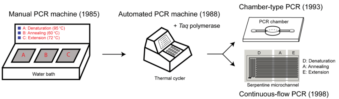 | 在学习过程中,我们经常会遇到各种PCR字眼,什么qPCR、RT-PCR、RT-qPCR、Real-Time PCR,好多同学看的头晕眼花也没弄明白这几种PCR有什么区别,那你呢?你了解PCR这个大家族吗?还在傻傻分不清吗?PCR是聚合酶链式反应(Polymerase Chain Reaction)的简称,是一种体外扩增特定DNA片段的分子生物学技术。PCR技术自问世以来,在生物科学领域、分子诊断领域、亲子鉴定、法医鉴定以及犯罪调查等方面发挥了巨大作用,是迄今为止最为重要的技术之一。经过演化和革新,PCR技术已经发展了三代:普通PCR技术、实时荧光定量PCR技术(qPCR)以及数字PCR(dPCR)技术。图1 PCR仪器的发展历程(Lee NY., 2018)PCR的基本原理与DNA的体内复制相类似,其特异性依赖于与靶序列两端互补的寡核苷酸引物。PCR由变性、退火和延伸三个基本反应步骤构成:①模板DNA的变性:模板DNA经高温(95℃左右)加热一定时间后,使其解离成单链,以便它与引物结合;②模板DNA与引物的退火(复性):将温度降至55℃左右时,引物与模板DNA单链按碱基互补配对的原则结合;③引物的延伸:再将温度调至72℃左右(DNA聚合酶最适反应温度),DNA模板和引物结合物在Taq DNA聚合酶的作用下,按碱基配对与半保留复制原理,沿着磷酸到五碳糖(5'→3')的方向合成一条新的与模板DNA链互补的半保留复制链。这样经变性、退火和延伸重复若干个循环后,就能将待扩目的基因扩增放大几百万倍。图2 PCR的基本反应步骤(图片源自:Wikipedia)普通PCR即一代PCR,使用普通PCR扩增仪扩增靶基因,并通过琼脂糖凝胶电泳对产物进行定性分析。2.实时荧光定量PCR(Quantitative Real-time PCR, qPCR)实时荧光定量PCR,也叫Real-Time PCR,即二代PCR,是指在PCR扩增反应体系中加入荧光染料或者荧光基团,在整个PCR过程中通过收集荧光信号实时监测每一个循环中扩增产物量的变化,最后通过标准曲线和CT值对待测样品进行定量分析。qPCR常用的有两种方法:SYBR Green法和TaqMan探针法。①荧光染料法(SYBR Green):SYBR Green Ⅰ是荧光定量PCR中最常用的荧光染料,它能与所有的双链DNA结合。在PCR反应体系中,加入SYBR Green Ⅰ,它就会在过程中与双链DNA结合,从而产生荧光信号。因此,反应中发出的全部荧光信号就会与反应中双链DNA的量呈正比,荧光强度也会随着产物的增加而增加。但是由于染料与双链DNA是非特异性结合,因此可能产生假阳性的结果。优点:价格相对较低;使用方便;对DNA模板没有选择,通用性好;检测灵敏度高。缺点:可能产生假阳性结果,需要通过熔解曲线分析识别扩增产物的特异性;需要不断优化反应体系以降低非特异性扩增;不适合进行多重qPCR检测。②荧光探针法(TaqMan技术):TaqMan探针是最早用于定量的方法,也是临床检测中最常用的检测方法。PCR扩增时,加入一对引物的同时再加入一个特异性的荧光探针。该探针是一个寡核苷酸,5'端标记一个荧光报告基团(Reporter, R),3'端标记一个淬灭基团(Quencher, Q)。当探针完整时,报告基团发射的荧光信号被淬灭基团吸收,以至于无法检测到荧光信号;而当PCR扩增时(在延伸阶段),探针会被Taq酶的5'→3'外切酶活性酶切降解,使报告基团和淬灭基团分离,报告基团发射底的荧光不会再被吸收,从而可以在荧光监测系统接收到荧光信号,即每扩增一条DNA,就形成一个荧光分子,PCR产物的形成与荧光分子的形成完全同步,PCR产物越多,荧光信号累积的越多,荧光强度越大。优点:检测特异性强;灵敏度高;适合进行多重qPCR检测;PCR后续无需处理,节省时间和原料成本。缺点:需要根据不同的序列,合成不同的探针;探针的水解依赖Taq酶外切酶的活性,定量时容易受试剂和酶性能影响;淬灭难以彻底,本底较高;检测结果很难判断实际的扩增特性。图3 荧光染料法和荧光探针法的工作原理(Cao et al., 2020)注:多重PCR,也称多重引物PCR或复合PCR,是在一个反应体系中加入两对以上引物,同时扩增出多个核酸片段的一种新型PCR扩增技术。3.数字PCR(Digital PCR, Dig-PCR, dPCR)数字PCR即三代PCR,是对原始PCR的另一种改进,是一种能够实现核酸绝对定量的精准检测技术,基于泊松分布原理将核酸样品分配到大量独立、平行的微反应单元(纳升级)中,使每个反应室中平均只有一个拷贝或者没有目标DNA分子,然后加入荧光信号进行扩增,从而实现靶标核酸分子的绝对计数,提高检测灵敏度和准确度。4. 逆转录PCR( Reverse T ranscription - PCR , RT - PCR)逆转录PCR也叫反转录PCR,将RNA的反转录(RT)和cDNA的聚合酶链式扩增相结合,是PCR的一种广泛应用的变形。在RT-PCR中首先经反转录酶将一条单链RNA逆转录成cDNA,再以cDNA为模板,扩增合成目的片段。作为模板的RNA可以是总RNA、mRNA或体外转录的RNA产物。无论使用何种RNA,关键是确保RNA中无RNA酶和基因组DNA的污染。RT-PCR技术灵敏且应用广泛,可用于检测细胞中基因表达水平,细胞中RNA病毒的含量和直接克隆特定基因的cDNA序列。一般通过一步法或两步法进行,一步法是RT反应和PCR反应在同一试管中进行;而在两步法中两个反应是分开依次进行的。5.实时荧光定量逆转录PCR(Real-time RT-PCR, RT-qPCR)Real-time RT-PCR是qPCR和RT-PCR的组合,其中的“RT”是Reverse transcription(逆转录)的意思,所以RT-qPCR就是结合了荧光定量技术的逆转录PCR,即以mRNA或总RNA为模板,先反转录得到cDNA,再以cDNA为模板,通过荧光定量PCR进行定量检测分析。因为RT-PCR只可以定性,但不能进行定量分析。与RT-PCR一样,RT-qPCR定量分析RNA也有两种方法:
