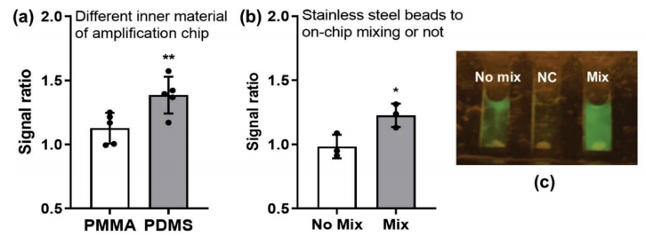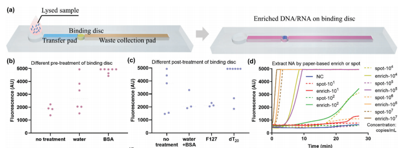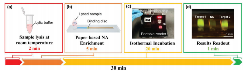 传染病大流行对全球医疗系统构成了巨大挑战。快速准确的诊断测试是有效防止病毒传播的关键。此外,致癌感染是一种重要的、潜在可预防的致癌因素。感染引发的癌症占全球所有癌症病例的1/6以上,对低资源环境中的人们造成了不成比例的影响。 尽管实验室中的精密诊断仪器可以提供高度灵敏、选择性和可重复的检测,但它们通常只在大城市的医院提供,而在许多缺乏必要基础设施的发展中国家无法使用。POCT是实验室测试的简化版本,近年来作为一种测试趋势迅速发展。该技术旨在在患者的护理场所或附近进行诊断分析,消除了对复杂实验室样本处理的需要,并快速获得测试结果。因此,它们可以被送到各种初级卫生服务设施和低资源地区,以扩大人口覆盖范围。核酸检测能够以高灵敏度和特异性检测微生物的核酸,在诊断各种病原体中发挥着重要作用。常规聚合酶链式反应(PCR)需要复杂的温度控制,不适合现场测试。等温核酸扩增,如RPA和环介导等温扩增(LAMP),是POCT分子诊断的有力方法,因为它们只需要恒温加热器,如水浴或加热块,而不需要热循环仪。RPA反应接近常温(37–42°C),快速高效,通常只需20分钟即可产生肉眼可分辨的结果。它有可能在POCT开发中实现便携式、高灵敏度以及多路检测。 已经开发了用于资源有限环境的各种核酸检测。例如,Jonathan Cooper小组开发了一种基于纸张的POCT设备,用于在40分钟内通过逆转录酶LAMP(RT-LAMP)进行病原体检测。然而,诸如非整合核酸提取、开放检测系统增加交叉污染风险、对昂贵设备(即移液管、商用加热器、离心机、LED透照器等)和基础设施(即交流电源)的依赖性等问题严重限制了POCT的应用,尤其是现场测试。 近日,一组来自中国的研究团队在杂志Advanced Science上发表了一篇题为“Portable Paper-Based Nucleic Acid Enrichment for Field Testing”的文章。在文章中,研究团队描述了一种简单的便携式快速感染病原体的检测平台,包括SARS-CoV-2和幽门螺旋杆菌。在一个典型的on-site测试设置中,样品到结果的周转时间短于30分钟。结果可以用肉眼读取,也可以通过智能手机应用程序进行分析。该平台是灵活的,可以在一次测试中检测多种病原体。该平台为任何地方的传染源检测提供了一种快速、准确和方便的方法。 图片来源:Advanced Science POCT平台的设计和运行 POCT平台的工作流中有四个主要步骤(如下图)。 (1) 样品收集和室温下裂解。 (2) 纸基核酸富集。将溶解的样品装入纸基富集芯片,并通过横向流动将核酸提取到结合盘(binding disc),然后用无水乙醇洗涤结合盘以快速除去残余水。 (3) RPA反应。将预安装管中的结合盘、引物、探针和RPA试剂加载到扩增芯片上,进行one-pot反应。芯片用粘土密封,并在40°C的电池供电便携式读取器中孵育20分钟。 (4) 结果读数。将芯片取出并放置在检测室中,并在488nm蓝光激发下观察。阳性对照显示亮绿色荧光,而阴性对照保持无色(或非常浅绿色荧光)。荧光结果可以直接从便携式读取器中可视化,并通过智能手机应用程序进一步分析。 POCT平台的工作流。图片来源:Advanced Science 核酸富集 研究团队设计了一种新型的基于纸张的核酸富集芯片,用于快速提取DNA/RNA。芯片上浓缩的核心是一个直径1.5 mm的纸装圆盘(图a)。将室温下使用裂解缓冲液裂解的100µL样品体积添加到样品装载区域,并通过毛细管作用穿过结合盘,核酸被捕获在结合盘上。干燥后的核酸结合盘,被直接用作RPA反应的扩增底物。在30分钟内,使用此纸基富集方法从核酸浓度低至100拷贝/毫升的样品中检测到荧光扩增信号。此纸基富集方法比普通FTA卡提取方法敏感100倍(图d)。一种可能的解释是,样品中更多的靶核酸被捕获在结合盘中,而扩增抑制剂通过侧向流被洗掉。 纸基的核酸富集方法。图片来源:Advanced Science 病原体的常温裂解 样品预处理的另一个关键问题是裂解。与纸基核酸富集相结合需要一种不加热的快速和室温裂解方法。研究团队在室温下测试了一些常见的裂解缓冲液(如Trizol、RIPA、NP-40和TritonX-100),以检测人造细菌或病毒样本。结果表明,Trizol和RIPA对人造病毒样品均表现良好,RIPA和NP-40对人造细菌样品均表现出色。 还通过实验验证了一个1.5毫米直径的结合盘足以进行核酸富集(图e,f)。此外还优化了用于富集的适当样品体积。结果显示,在1.5 mm结合盘上富集的100µL裂解样品的体积足以在8分钟的富集时间内获得满意的扩增(图g)。 纸基的样品预处理。图片来源:Advanced Science 便携式读取器的结构 研究团队设计并制造了一个可充电便携式读取器,用于恒温加热和终点荧光输出(图a,b)。便携式阅读器小巧轻便(15厘米×13厘米×7厘米,重量仅500克)。使用一对可充电锂电池,一次充电可使其运行8-9小时,并支持至少24批测试。实验室制造成本低于30美元,并且便携式读取器在每次使用后不需要更换或清洁。 恒温培养单元、视觉读出单元、温度控制器和双18650电池集成到电池供电的便携式读取器中。等温培养单元主要是两个加热垫,设置在加热室底部和盖子上,用于扩增芯片的加热。视觉读出单元是488nm蓝光和塑料发射滤光片。 POCT平台的结构。图片来源:Advanced Science one-pot检测 芯片上采用one-pot扩增,整个反应在密封系统中进行,无需打开盖子,可以有效避免环境气溶胶污染导至的假阳性结果。为了在芯片上快速完成RPA,需要解决两个主要