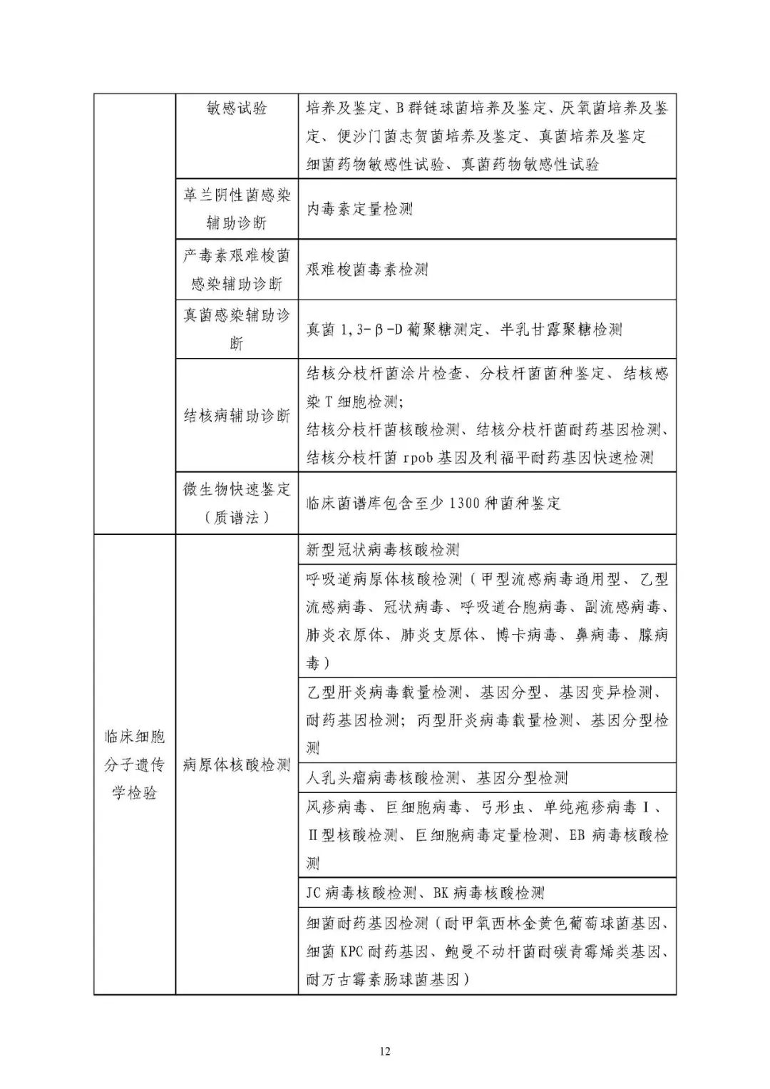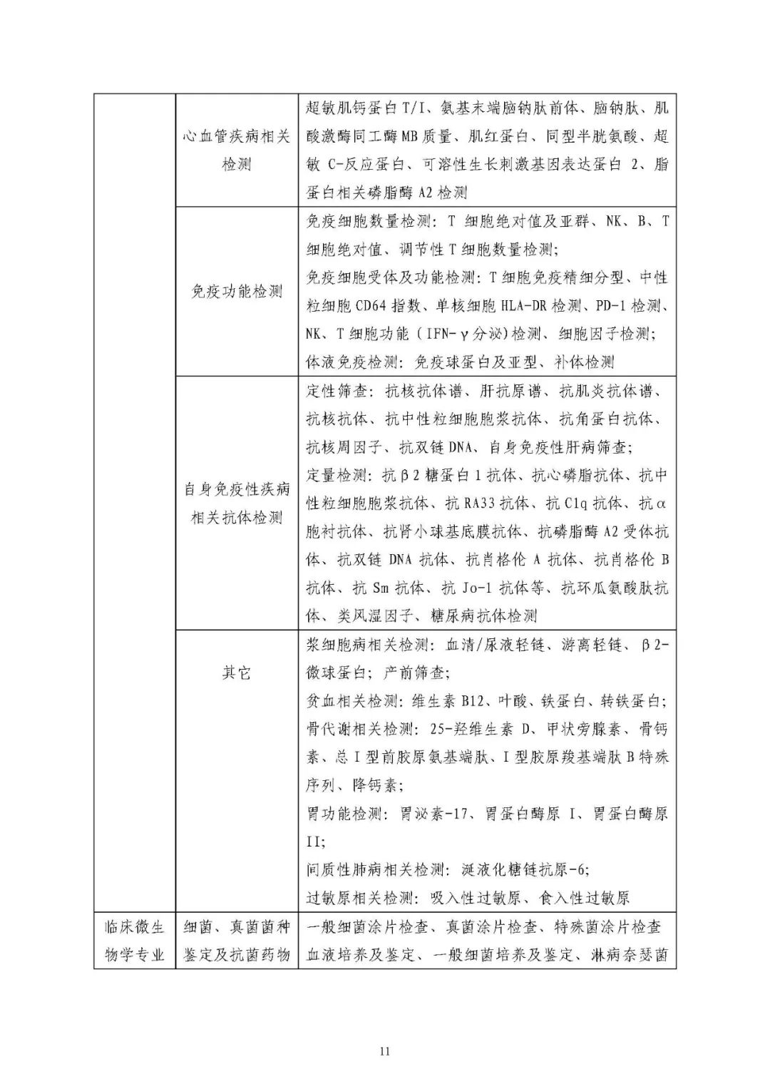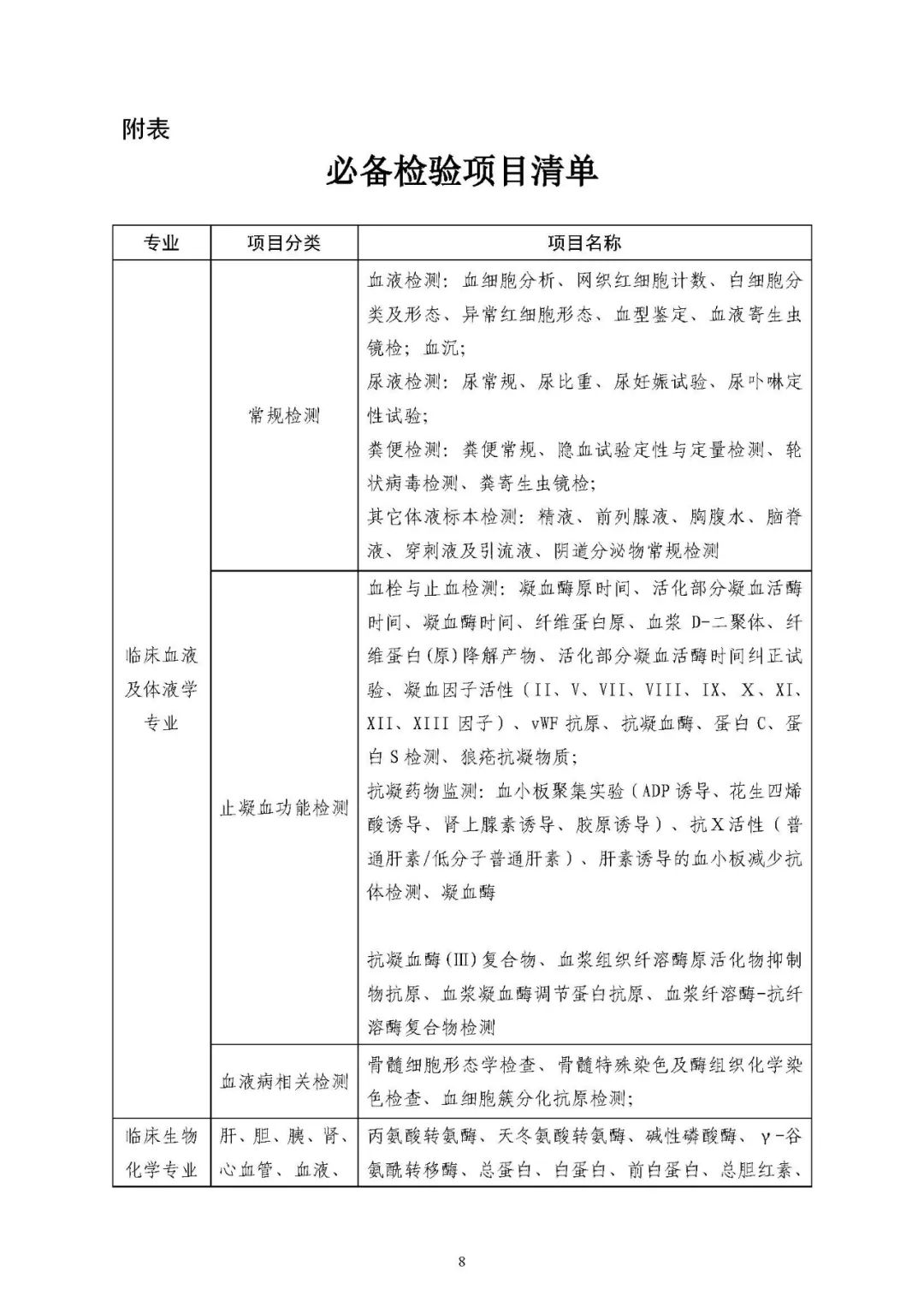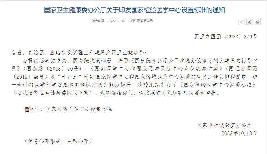 | 2022年11月,国家卫生健康委办公厅发布关于印发国家检验医学中心设置标准的通知,并制定了《国家检验医学中心设置标准》,国家检验医学中心应当具备重大疾病以及疑难病与危重症和突发传染病诊疗相关检验能力,具备辐射和指导基层检验服务能力和水平提高的能力,以及未来3年,国家检验医学中心开展的必备检验项目清单(见附表)。在必备检验项目清单中,共设置了5个专业(临床血液及体液学专业、临床生物化学专业、临床免疫学专业、临床微生物学专业、临床细胞分子遗传学检验)和26个分类。
