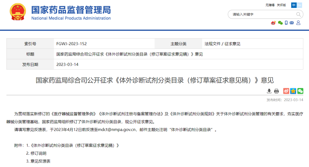 3月14日,国家药监局官网发布公告称,为贯彻落实新修订的《医疗器械监督管理条例》《体外诊断试剂注册与备案管理办法》及《体外诊断试剂分类规则》中体外诊断试剂分类管理的要求,夯实体外诊断试剂分类管理基础,国家药监局组织开展了《体外诊断试剂分类目录》修订工作,形成了《体外诊断试剂分类目录(修订草案征求意见稿)》(以下简称《征求意见稿》),并向社会公开征求意见。