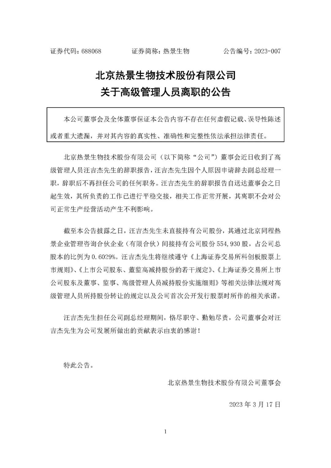热景生物3月16日晚间发布公告称,汪吉杰先生因个人原因申请辞去副总经理一职,辞职后不再担任公司的任何职务。截至本公告披露之日,汪吉杰先生未直接持有公司股份,其通过北京同程热景企业管理咨询合伙企业间接持有公司股份约55万股,占公司总股本的比例为0.6029%。 据公司2021年年报介绍,汪吉杰先生简历如下: 1997年7月毕业于同济大学,2015年1月毕业于中国科学院大学项目管理(生物工程方向)专业。1997年7月至2001年3月,任北京市加气混凝土厂技术质量科科长助理;2001年3月至2007年6月,任北京浩奥博科技有限公司质量部经理;2007年6月至2011年11月,任北京海瑞祥天生物科技有限公司管理者代表;2011年11月至今,任热景有限、热景生物副总经理;2016年5月至今,任热景生物董事。2021年,在公司的薪酬为559.46万。 IVD资讯整理自热景公告 |