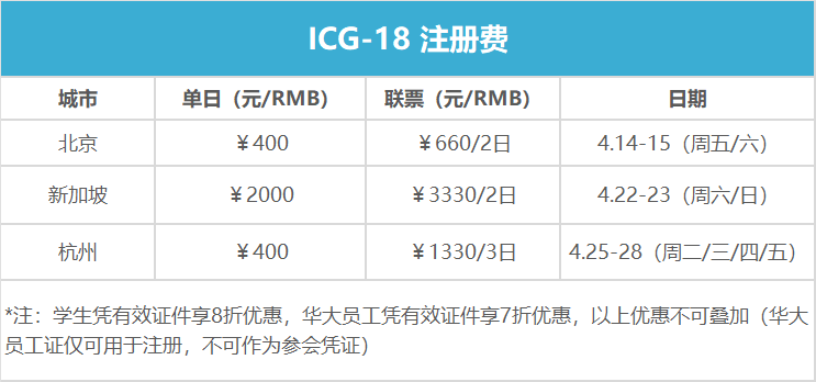 历来备受瞩目的国际基因组学大会 将于2023年4月迎来她的18岁“成人礼”! 秉承“基因科技造福人类”的初心, 国际基因组学大会已走过17年 ICG-18也将继续“不忘初心,砥砺前行”! 参与ICG-18你能获得什么? ①跟全球生命科学行业精英面对面对谈! ②与时俱进!get基因组学领域创新前沿报告! ③更有HGP20周年笔记本套装、 环保袋等精美周边等你来领! 北京会场 4月14-15日 「HGP完成20周年纪念与生物多样性」 新加坡会场 4月22日-23日 「从电子世纪到生物世纪的跨越」 杭州会场 4月25日-28日 「DNA“双螺旋”结构发现70周年与长三角生物科研与产业发展」 欢迎扫码立即注册共襄盛会! 一、ICG-18简介 国际基因组学大会第18届年会(ICG-18)已定于2023年4月12日至28日在张家界、北京、西安、伦敦、南京、温州、深圳(同期举办)、武汉(同期举办-待定)、新加坡、杭州等地举行。 ICG-18将继续发扬人类基因组计划(HGP)“共有、共为、共享”的精神,倡导全世界合作和全人类分享,特别是促进发展中国家的国际合作。 会议将囊括:纪念人类基因组计划 HGP 中国卷筹备会议25周年、HGP完成20周年纪念与生物多样性、HGP与表型组学/多组学发展、HGP与眼视光学发展、HGP与中西部生物产业发展、人类基因组计划(HGP)与生物技术教育峰会、从电子世纪到生物世纪的跨越、DNA“双螺旋”结构发现70周年与长三角生物科研与产业发展等多个主题。 ICG-18适逢“WHAT IS LIFE”演讲80周年、DNA双螺旋结构发现70周年、生命科学“第一语录”(杜布赞斯基)发表50周年以及人类基因组计划(HGP)完成20周年,我们将一同见证80/70/50/20年来生命科学飞速发展和改变社会的辉煌历程。 二、会议日程 日程持续更新中… 张家界4月12-13日 4月12日 ● 开场致辞 ● HGP中国卷筹备会议25周年回顾与思考圆桌会议 主持人:于军(北京基因组研究所(国家生物信息中心)荣誉研究员) ● 精准医学与罕见病 主持人:张抒扬(北京协和医院院长、党委副书记) 4月13日 ● 组学与生殖医学 主持人:黄荷凤(中国科学院院士、生殖医学家) ● 组学与传统医学 主持人:仝小林(中国科学院院士,中医内科学家) 北京4月14-15日 4月14日 ● 开场致辞 ● 纪念人类基因组计划HGP完成20周年 主持人:杨维才(中国科学院院士,中国科学院遗传与发育生物学研究所所长) 4月15日 ● 生物多样性 主持人:周晋峰(中国生物多样性保护与绿色发展基金会副理事长兼秘书长)、 Fred DUBEE(ICG-18国际顾问团联合主席)、Sara PLATTO(绿会BASE秘书长) 伦敦4月14日 日程更新中 南京4月16日 日程更新中 温州4月18日 日程更新中 武汉4月19-20日(同期举办-待定) 日程更新中 深圳4月19-20日(同期举办) 日程更新中 新加坡4月22-23日 4月22日 ● 开场致辞 ● “WHAT IS LIFE”演讲80周年的回顾与纪念 ● 发展中国家生命科学发展的不平等现象 ● 女性科学家论坛 4月23日 ● 全球公共健康与大流行 ● 创新技术与制药工艺的全球投资分析(mRNA、抗衰老等) 杭州4月25-28日 4月25日 ● 开幕式 ● DNA“双螺旋”结构发现70周年 ● 奥林匹克精神与日常运动 主持人:Vassilis KLISSOURAS(雅典大学运动医学和体育活动生物学系荣誉教授)、Yannis PITSILADIS(英国布莱顿大学体育与运动科学系教授) ● 时空组学&细胞治疗 主持人:刘龙奇(杭州华大生命科学研究院执行院长) ● 脑科学 主持人:刘石平(华大研究院脑科学主任科学家) ● DNA“双螺旋”结构发现70周年纪念晚宴 4月26日 ● 健康城市科学 主持人:仇保兴(城镇化理论与城市规划研究专家,住房和城乡建设部原副部长) ● 组学与未来10年的人工智能 主持人:Miltos Ladikas(德国卡尔斯鲁厄理工学院(KIT)高级研究员) ● TWAS-TACC专题讨论会 4月27日 ● 美洲华人遗传学会联合会议 主持人:周青(浙江大学求是特聘教授) ● 组学与演化 主持人:龙漫远(美国芝加哥大学埃德娜.K.帕帕希安杰出讲座教授) 4月28日 ● 癌症防治战略 ● 生物经济与新增长 1. 新技术带来新的应用场景 2. 全球合作背景下的人才引进与科技转化 3. 一直以来未被满足的需求-健康、长寿(抗衰、核酸药物)等议题 联合主办《哈佛商业评论》中文版新增长学院 媒体支持《哈佛商业评论》中文版、人民日报健康客户端 ● 闭幕式 三、拟邀请嘉宾 四、报名参会 1、注册方式: 会场:北京、新加坡、杭州 参与北京(4月14-15日)、新加坡(4月22-23日)、杭州(4月25-28日)会场请扫描/长按识别小程序码购票,按要求如实填写信息,缴费成功后将收到提示短信。 特别会场:张家界、南京、温州 张家界(4月12-13日)、南京(4月16日)、温州(4月18日)三地特别会场为邀请制。 参会人员请发送邮件至icg18@bictimes.cn ,邮件标题为姓名+参与会场名称,正文请附上姓名,会场,单位、职务、联系方式及申请原因,组委会审核通过后会与您取得联系(报名时间:2023.3.15-2023.4.5) 特别说明:华大内部参会,请于3月31日前将参会人员信息提交组委会(姓名、身份证号、手机、华大工号),参会人员需要单独购买午餐券,住宿自理(通过组委会预定会议酒店可享协议价)。 2、费用标准:(单位:元/人民币) 说明: