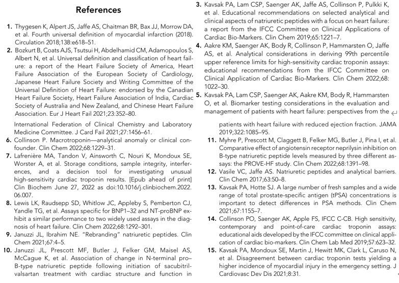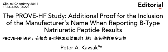 高敏心肌肌钙蛋白(hs-cTn)和钠尿肽(NP)二者,依据心肌梗死和心衰(HF)有关临床定义和实验室建议取得了一个prominent重要的角色(1-4)。但是,在这些生物标志物间检测的解释依然有值得注意的差异。例如,hs-cTnI或hs-cTnT检测的详细的检测性能特定的参考上限(即明确特性的健康人群的第99的百分位数),已经被支持(1,4);与用于所有B-型NP(BNP)和氨基端(NT)-proBNP检测相反(2,5)。分析上,对hs-cTn检测已经被很大的关注,导至不同检测产品的不同值的变异(6,7),而BNP和NT-proBNP检测,被更多地关注在这些多肽的处理和降解上(3,8)。也许在hs-cTn和NP检测间有不同关注的原因,部分会与NP和靶向治疗的生物学有关(8-10)